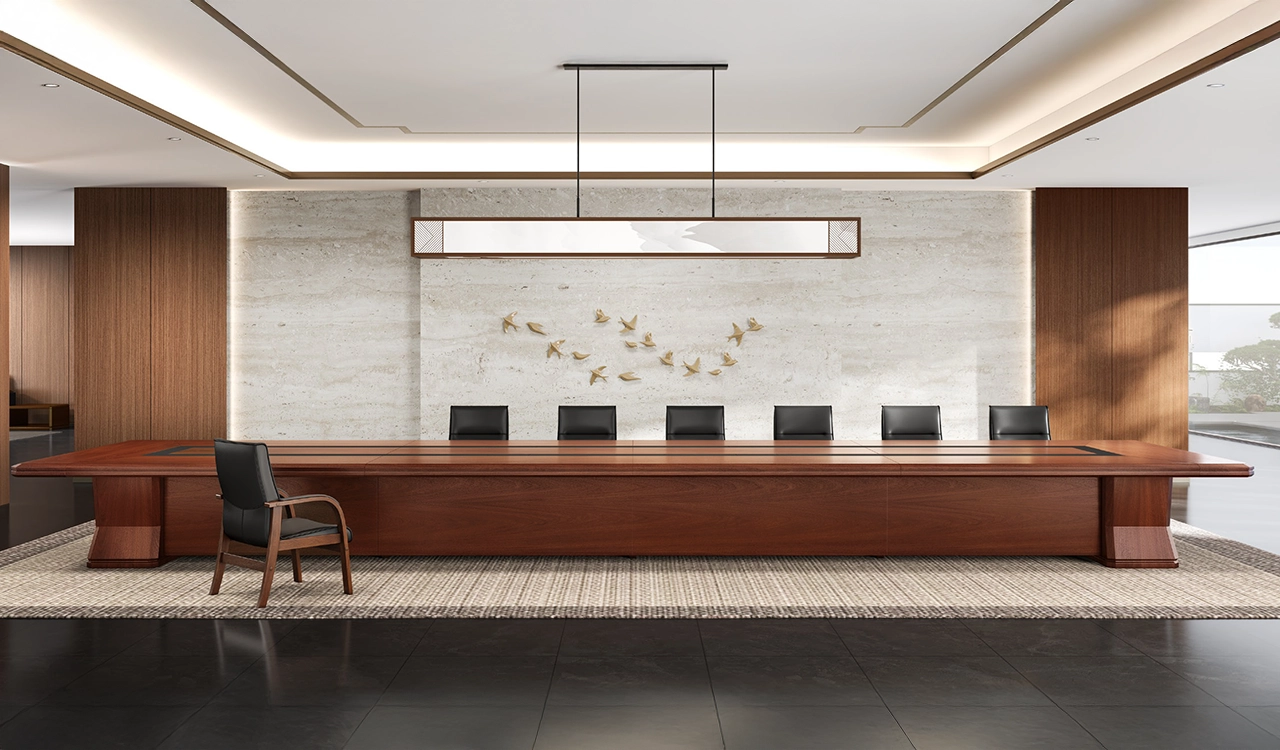 A luxuriously designed 24-seater boardroom table, exquisitely crafted in rich Sapele veneer with inlaid leather accent. Part of the premium Imperial Series, it features elegant solid wood edge banding and a fully enclosed pedestal and panel base for a seamless, sophisticated look. An integrated wire management system includes 10 discreetly concealed wireboxes on the tabletop, each equipped with power, HDMI and data ports. Perfectly suited for corporate boardrooms and institutional meeting spaces.