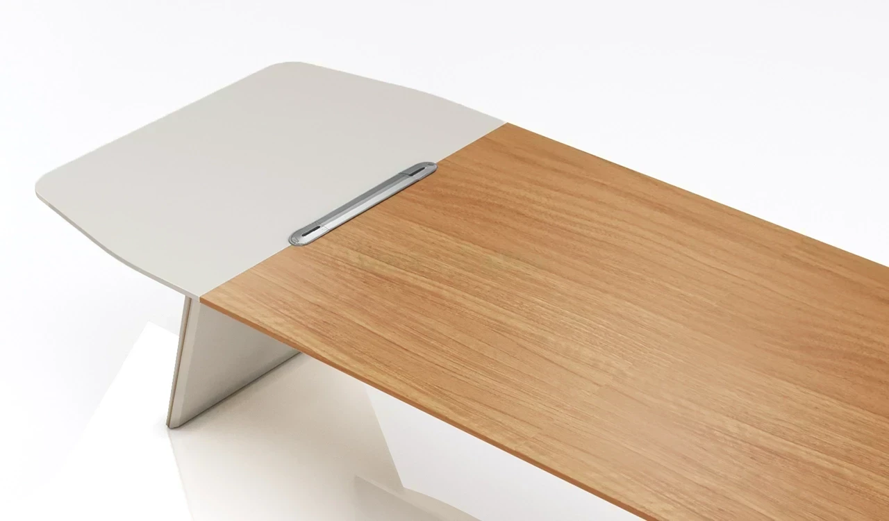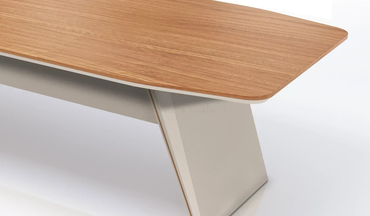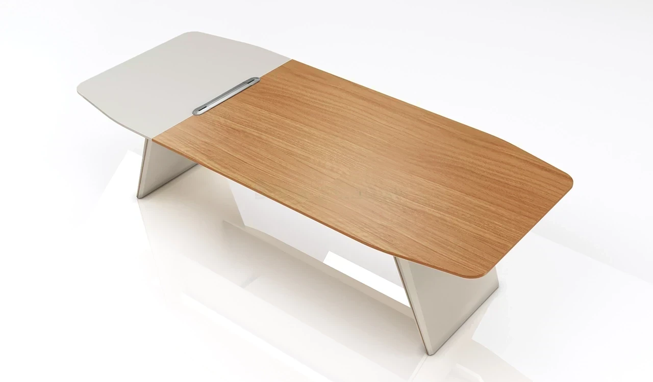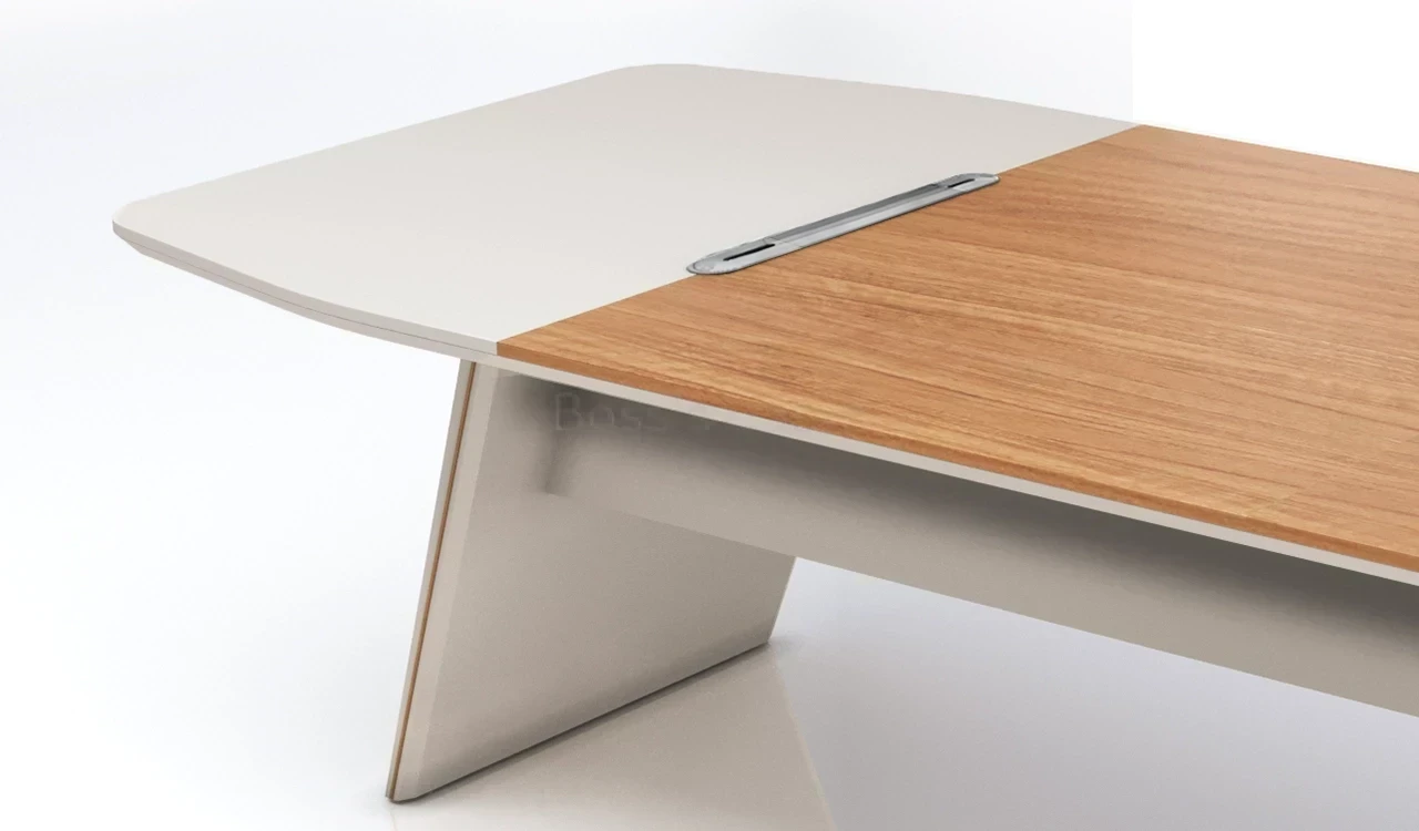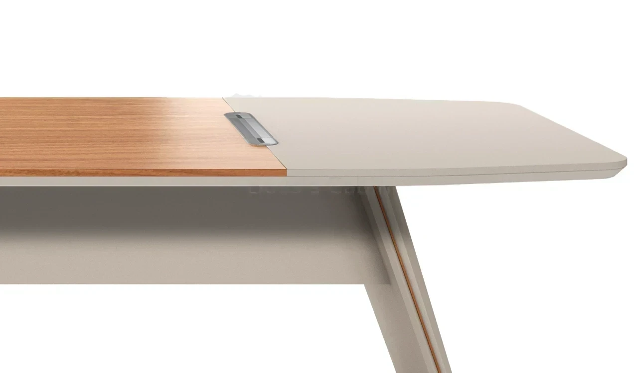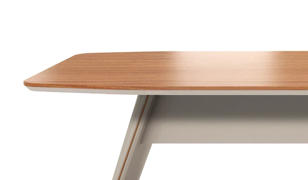 A modern meeting table in rich sandalwood and seagull gray laminate, featuring a double-layer octagonal top with rounded corners, chamfered edges, and dual-tone edging. Slanted legs with subtle matte gold metal inlays add a refined touch. A sleek wire management grommet allows easy device connectivity from floor-mounted power points. Part of the Swan Series, ideal for cabins of 150 sq. ft. and above.