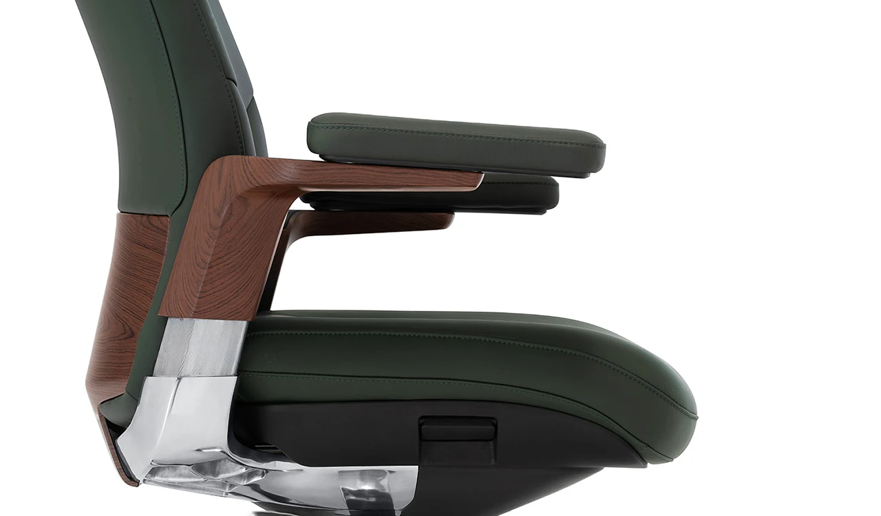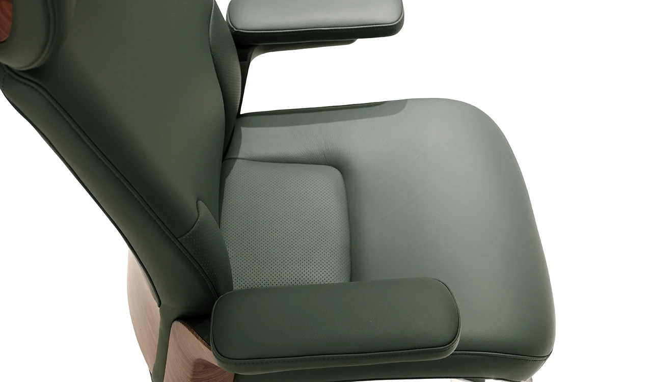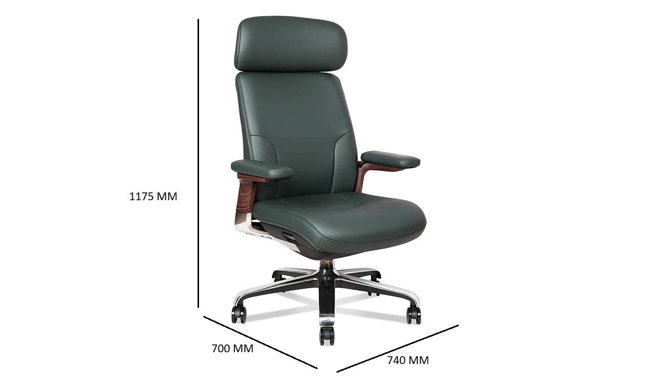 A regal chair upholstered in rich Italian leather, designed to provide both luxury and comfort. The sculpted backrest with walnut finish lower back & headrest accent is paired with high-density molded foam and a durable plastic frame for lasting durability. Featuring height adjustable headrest and armrests, it adapts seamlessly to individual needs. The synchronized mechanism with seat sliding ensures ergonomic balance, while the polished aluminum base with PU casters offers stability and effortless movement. Part of our Regent Series of chairs its a statement piece of refined craftsmanship.