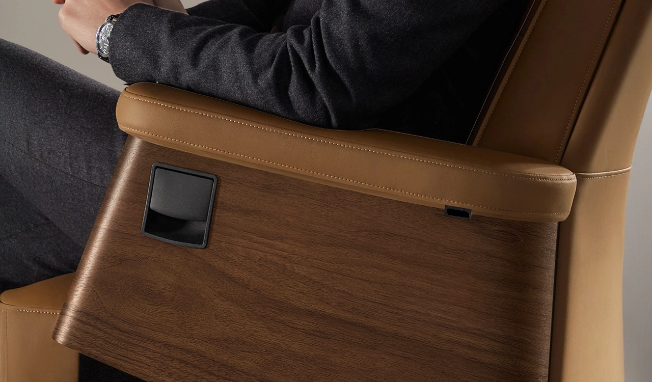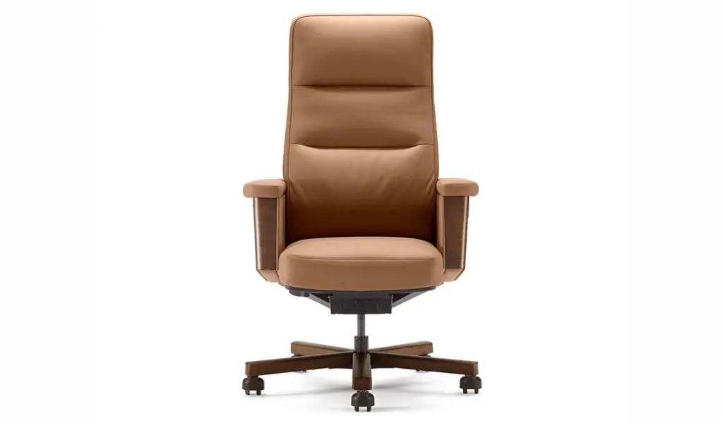 A plush high-back chair designed for ultimate comfort and elegance. The seat and back combine high-density cut cotton with luxurious down feather fillings for soft yet supportive seating. Upholstered in premium nappa leather with walnut veneer clad arms it exudes sophistication. A synchronized tilt mechanism with three lockable positions ensures ergonomic adaptability, while a solid wood base with smooth PU casters provides stability and effortless mobility. Perfectly blending plush comfort with modern functionality, this Royale Series chair is your answer to ultimate luxury.