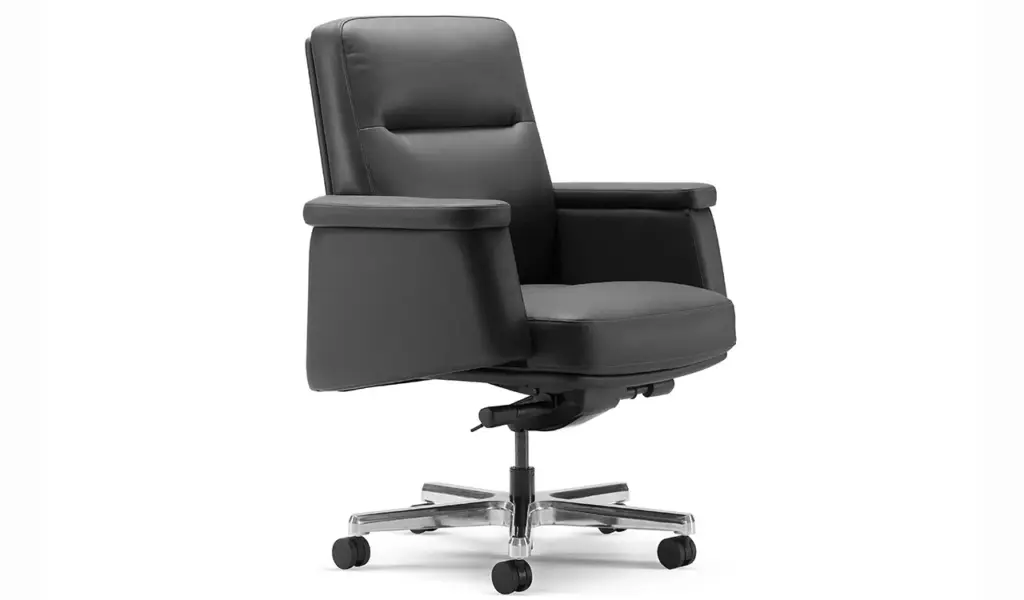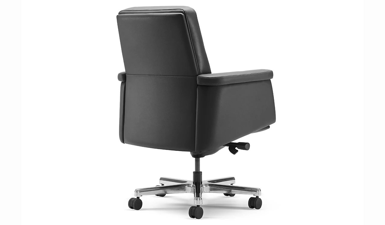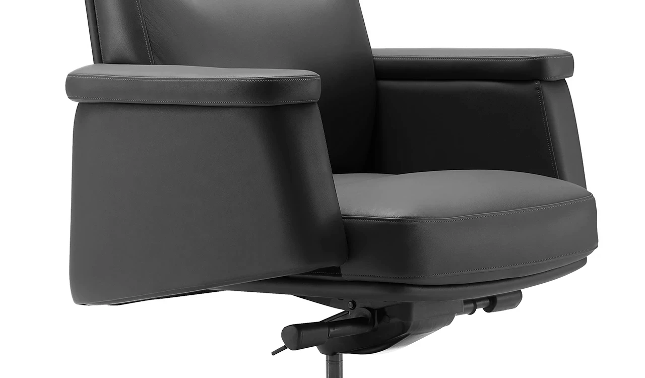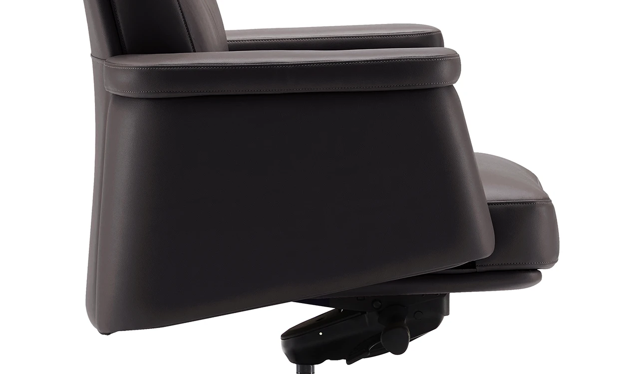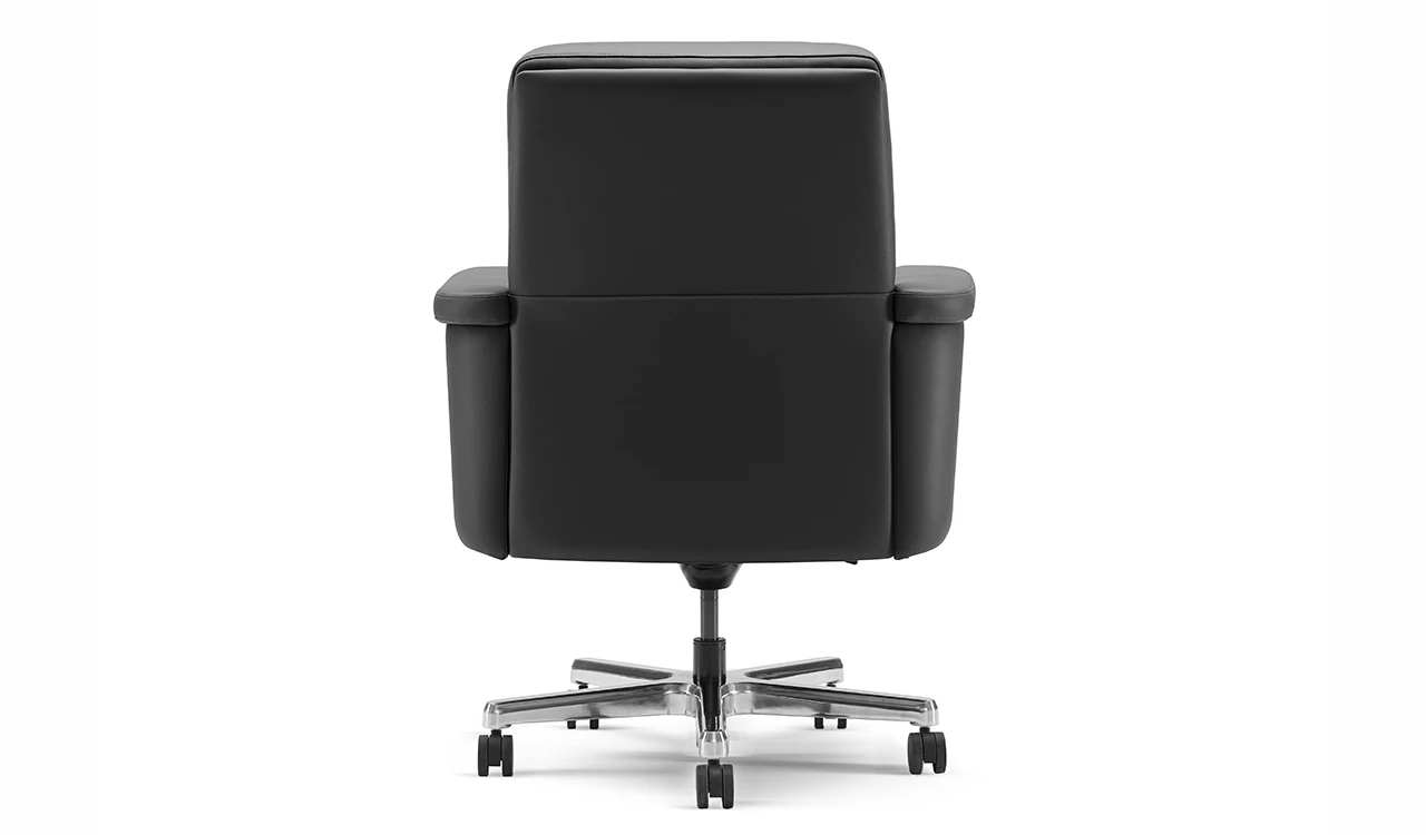 A plush mid-back chair designed for ultimate comfort and elegance. The seat and back combine high-density cut cotton with luxurious down feather fillings for soft yet supportive seating. Upholstered in genuine leather with leather clad arms it exudes sophistication. A synchronized tilt mechanism with three lockable positions ensures ergonomic adaptability, while the aluminum alloy base with smooth PU casters provides stability and effortless mobility. Perfectly blending plush comfort with modern functionality, this Royale Series chair is your answer to ultimate luxury.
