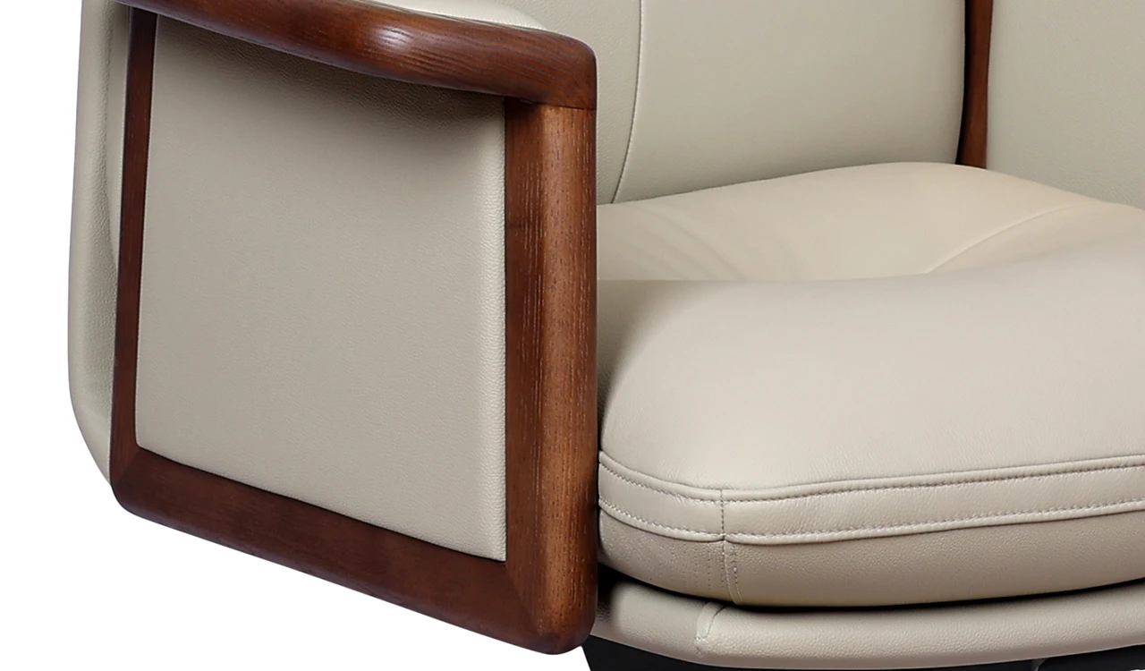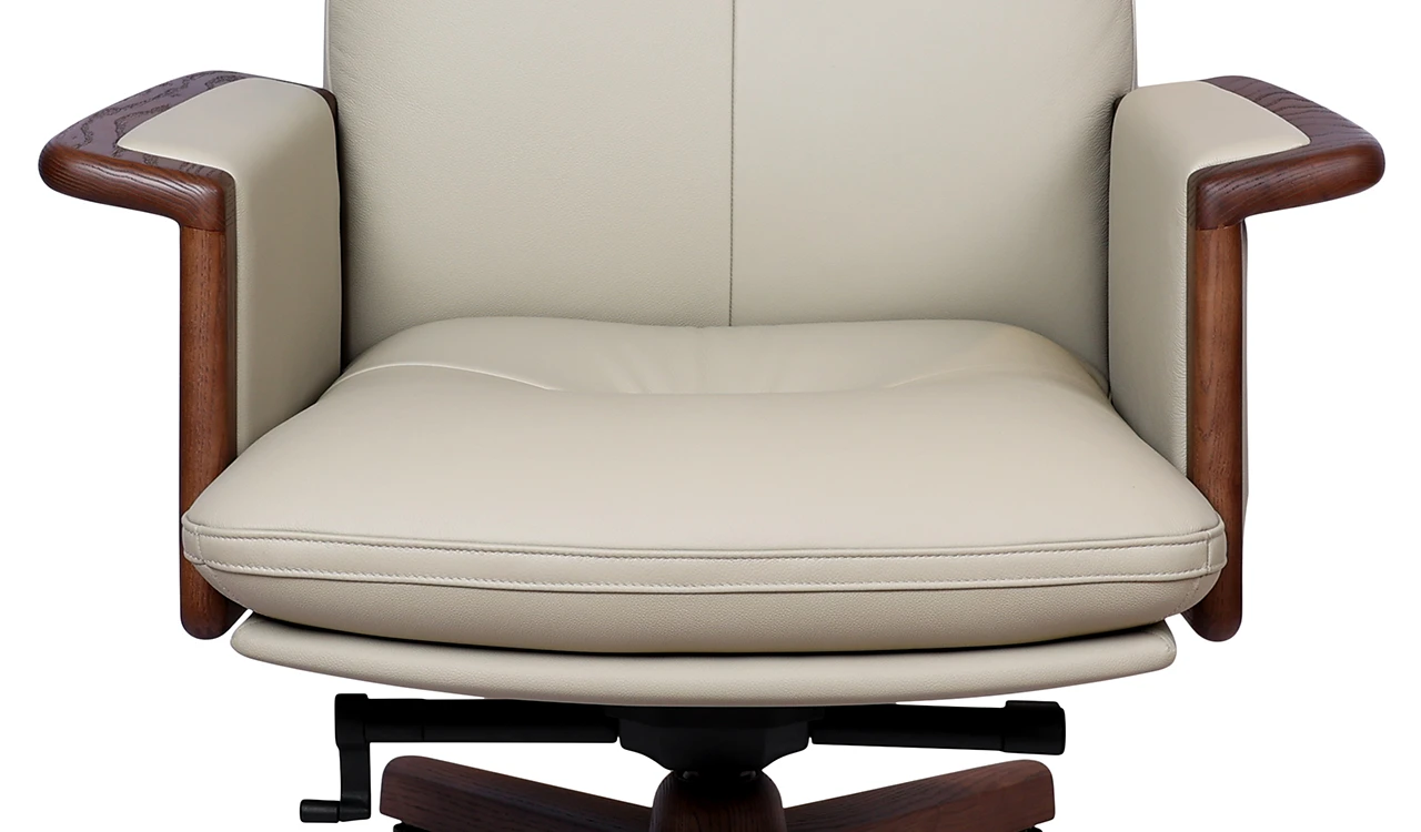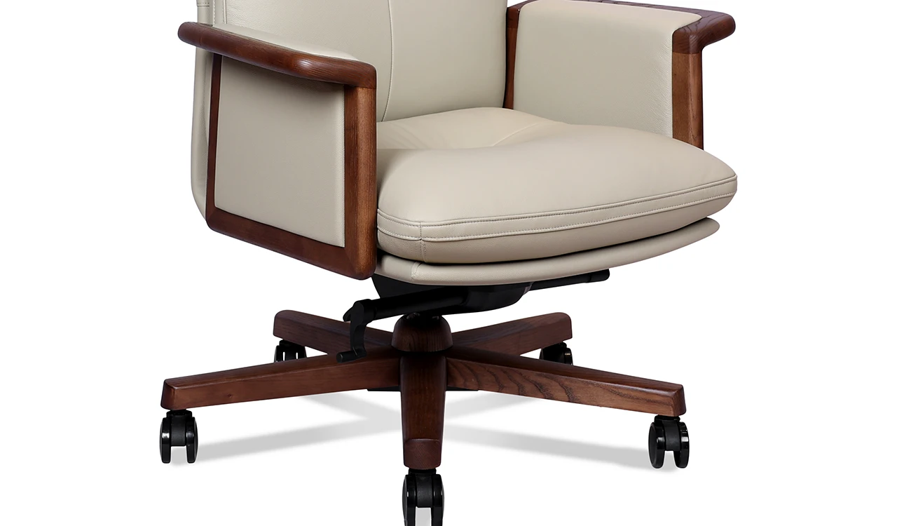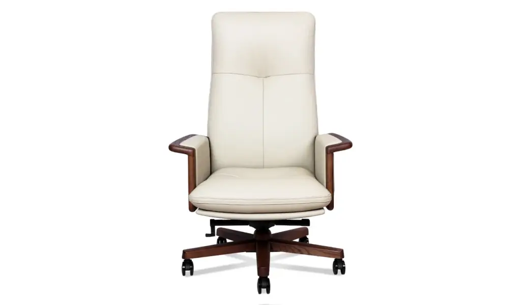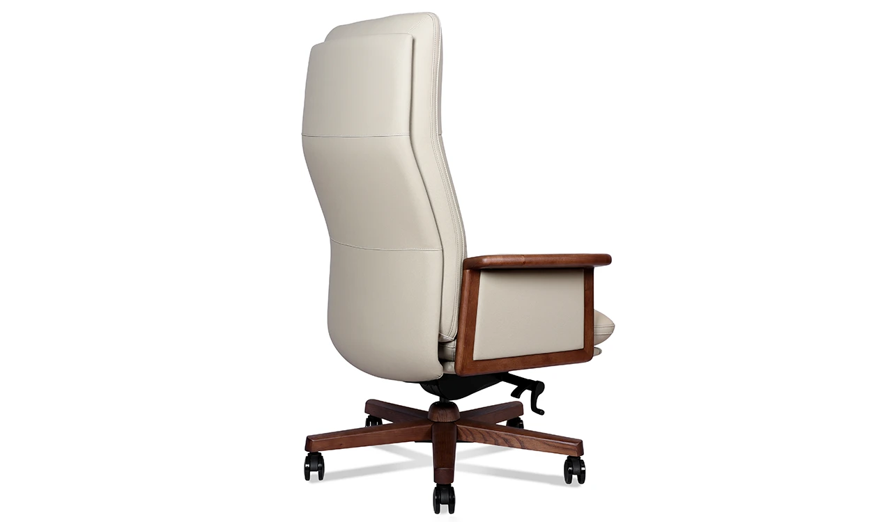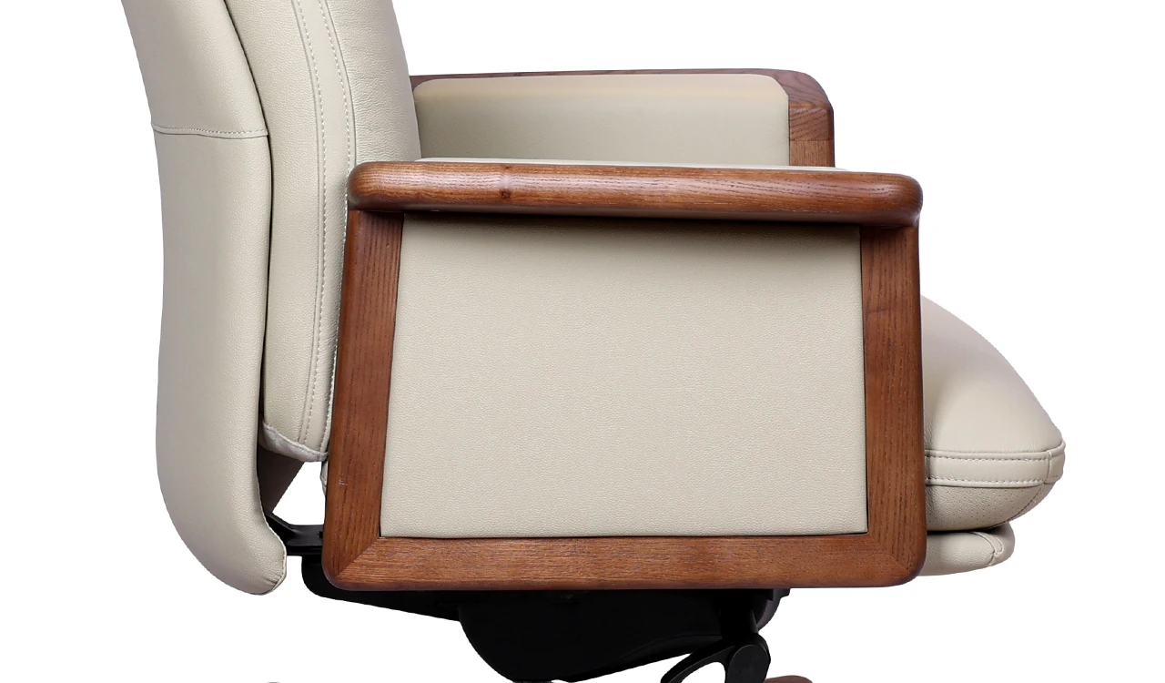 A high-back office chair exuding timeless elegance and comfort. Upholstered in luxurious beige Italian leather, it features walnut wood armrest trims and a matching wooden base, highlighting its enduring appeal. High-density molded foam ensures lasting support, while a synchronized tilt mechanism with four lockable positions offers personalized ergonomic adjustment. The sturdy aluminaum alloy and wood base with smooth PU casters provides stability and effortless mobility. Part of the premium Tudor Series it perfectly blends classic materials with modern functionality.