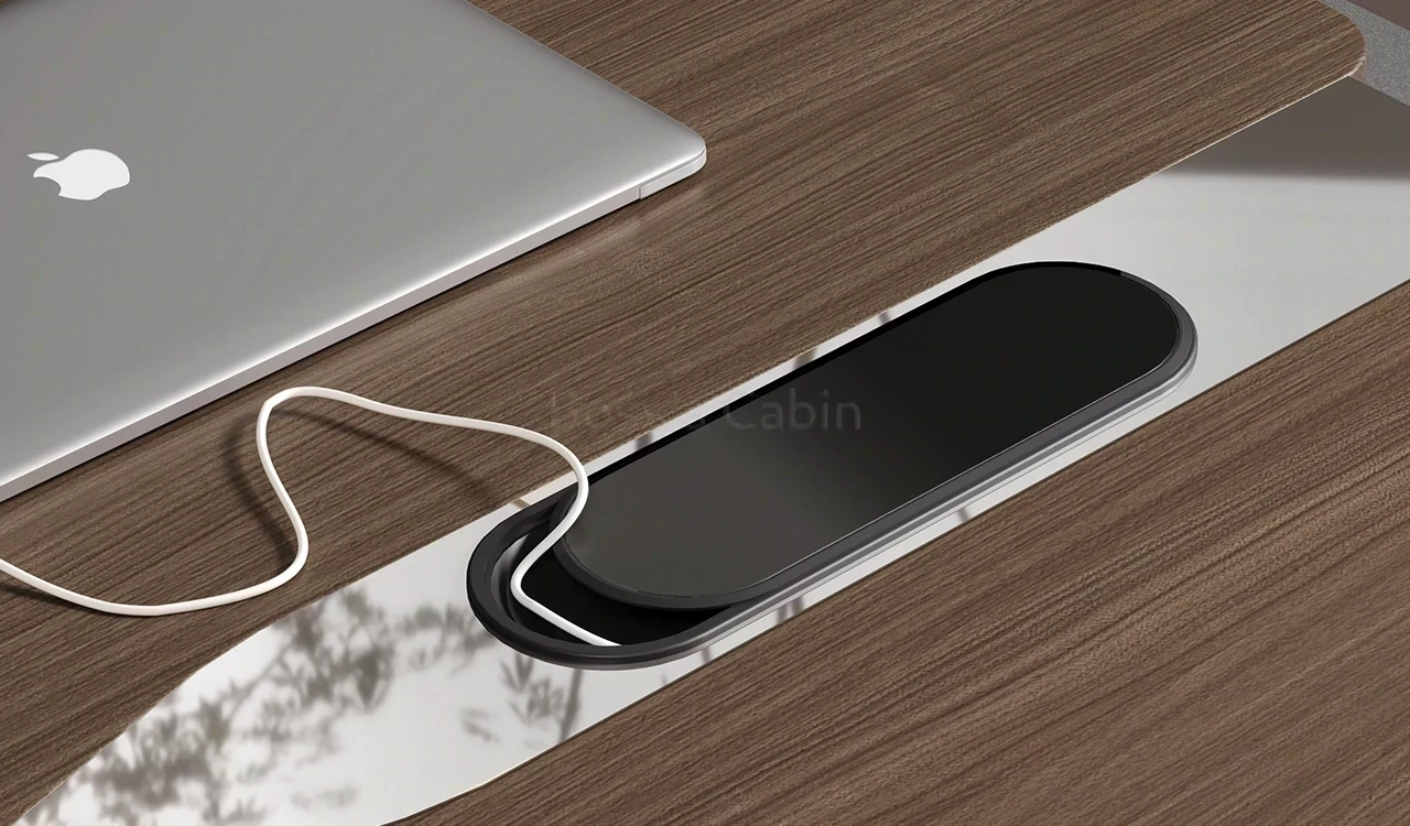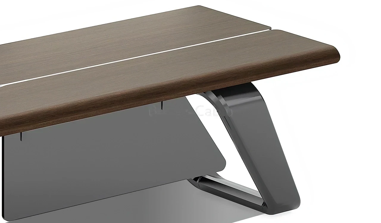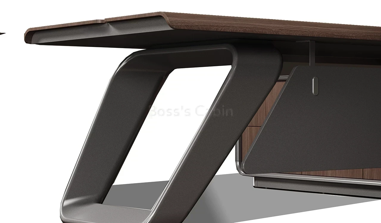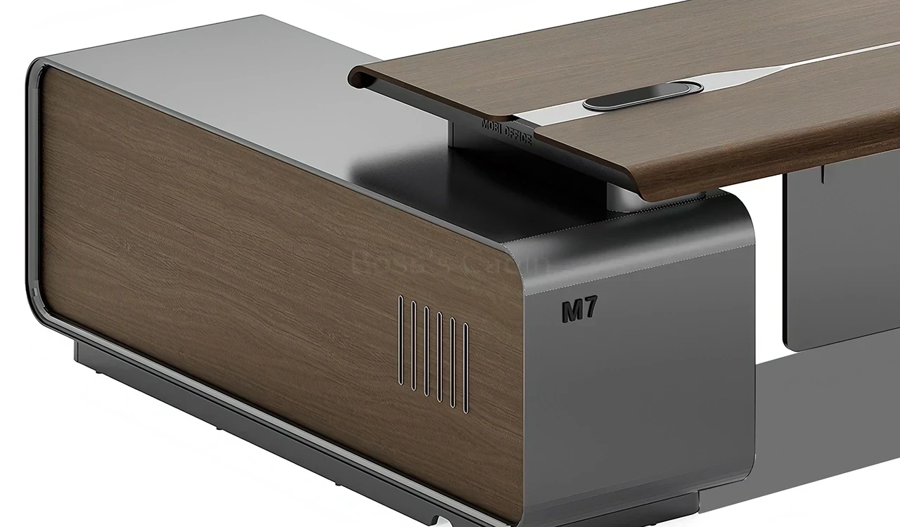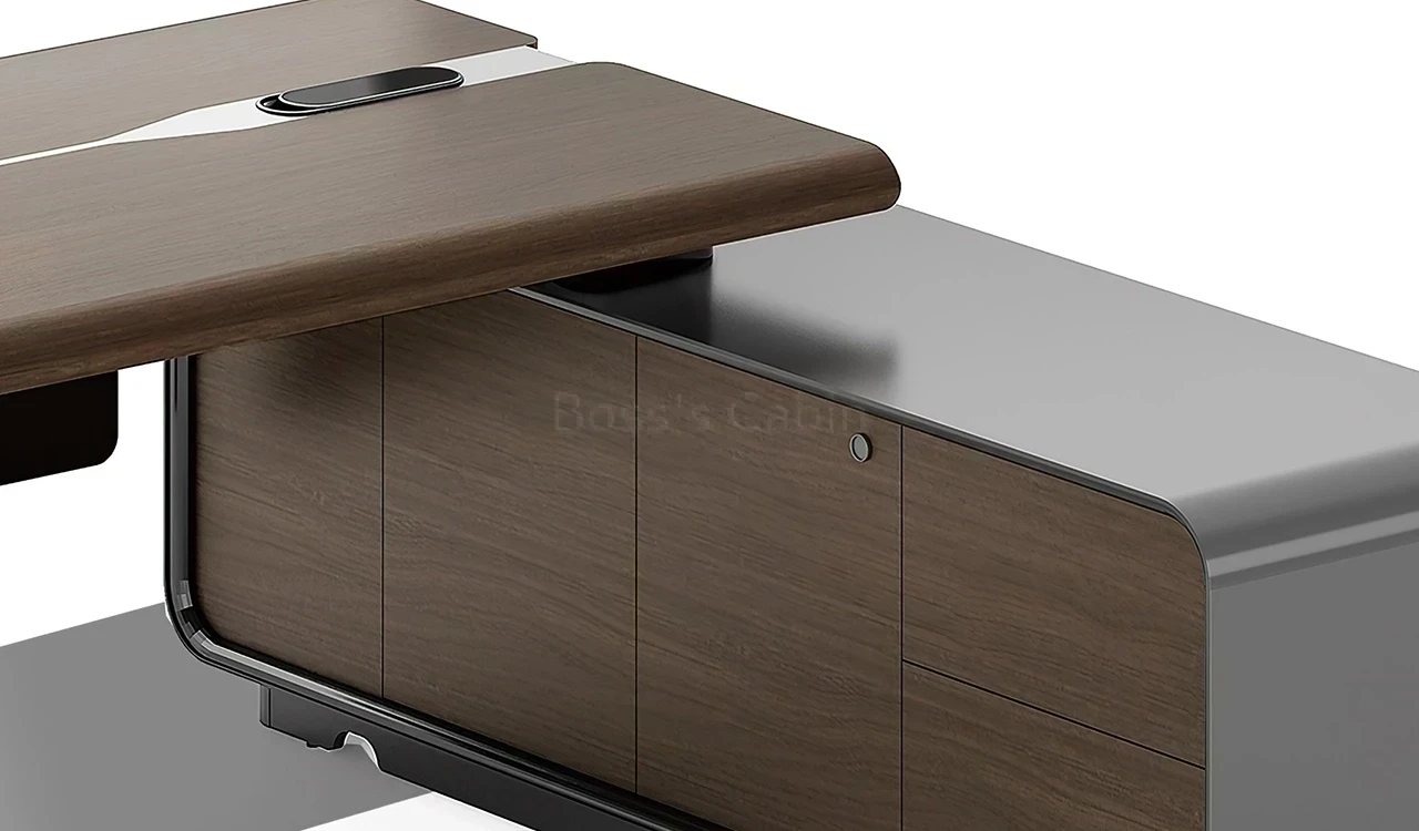 1. Wrap over tabletop in walnut and silver gray combination. 2. Side cabinet with swing door/drawers with biometric lock. 3. Tabletop with integrated wirebox and sockets.