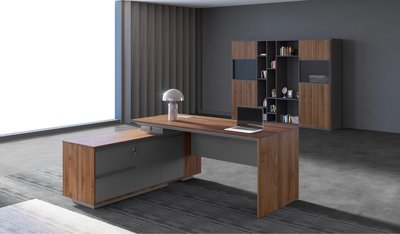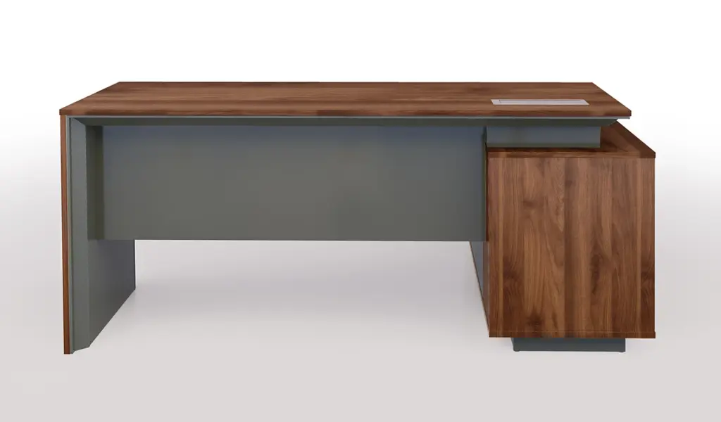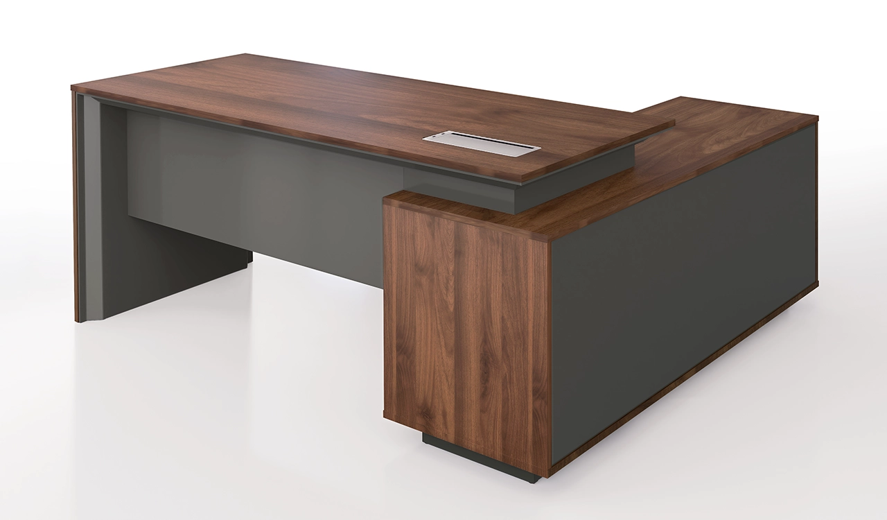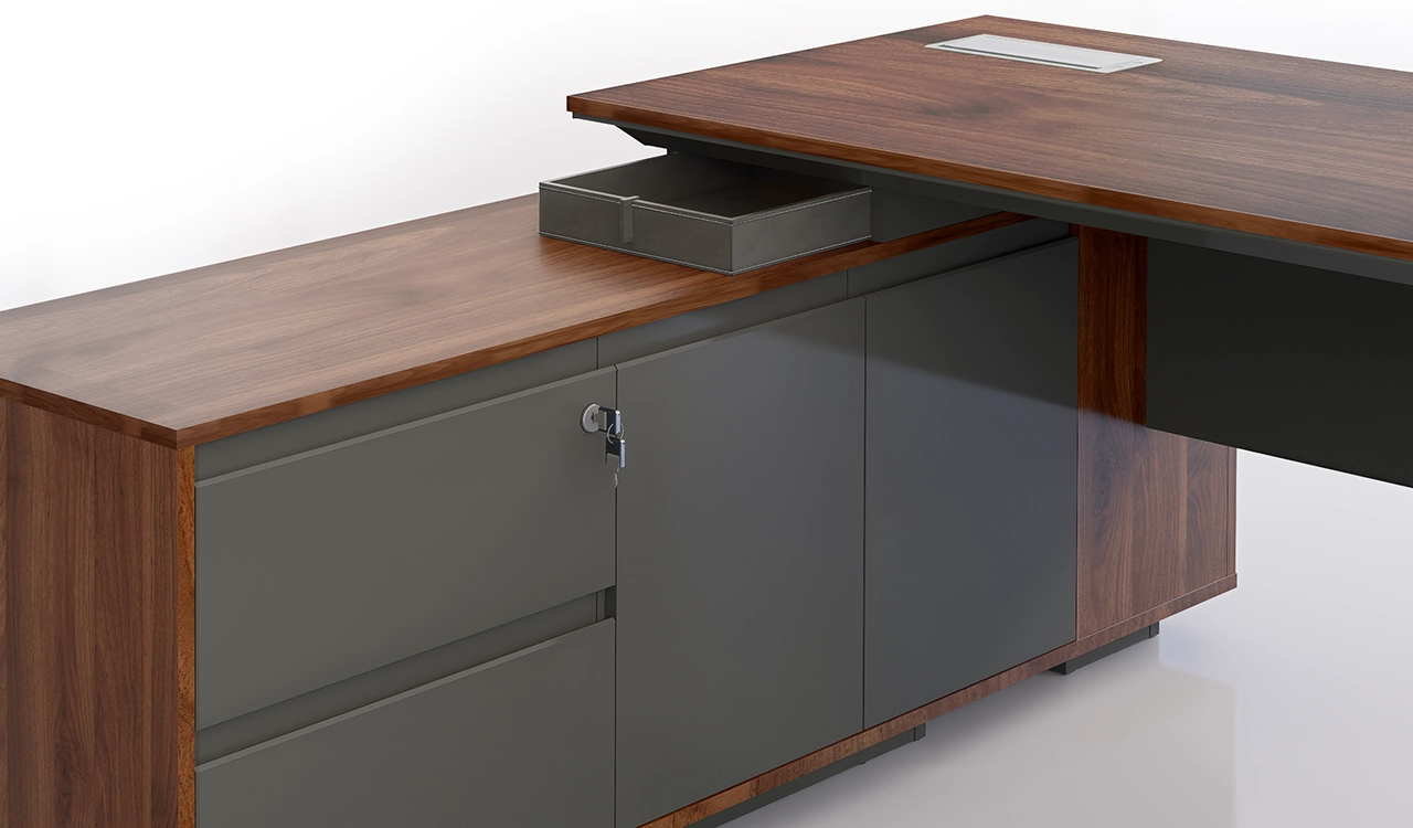 This contemporary executive desk with side cabinet looks best in its original Felix walnut and meteor gray colors.