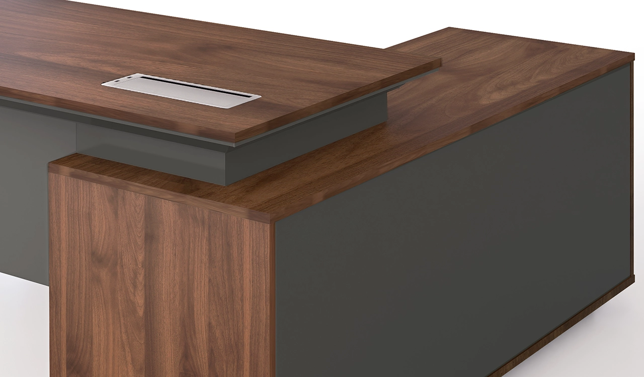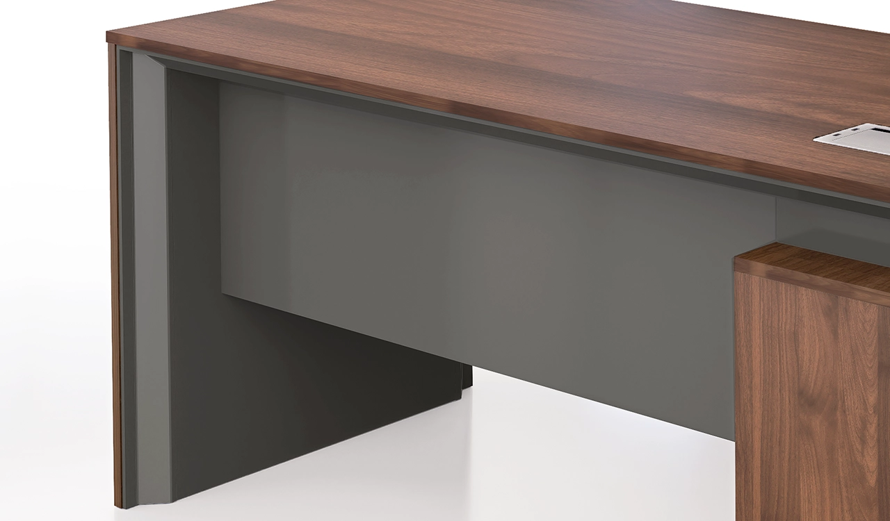 Made with environment grade engineered wood and natural wood laminate with tapered edges. The E1 rated MDF is a highly durable material and a world standard for premium office furniture while the walnut wood veneer is from our carefully selected range of premium natural wood veneers with consistent color and grain structure.