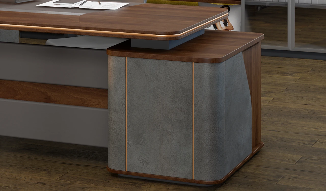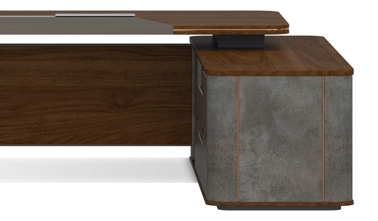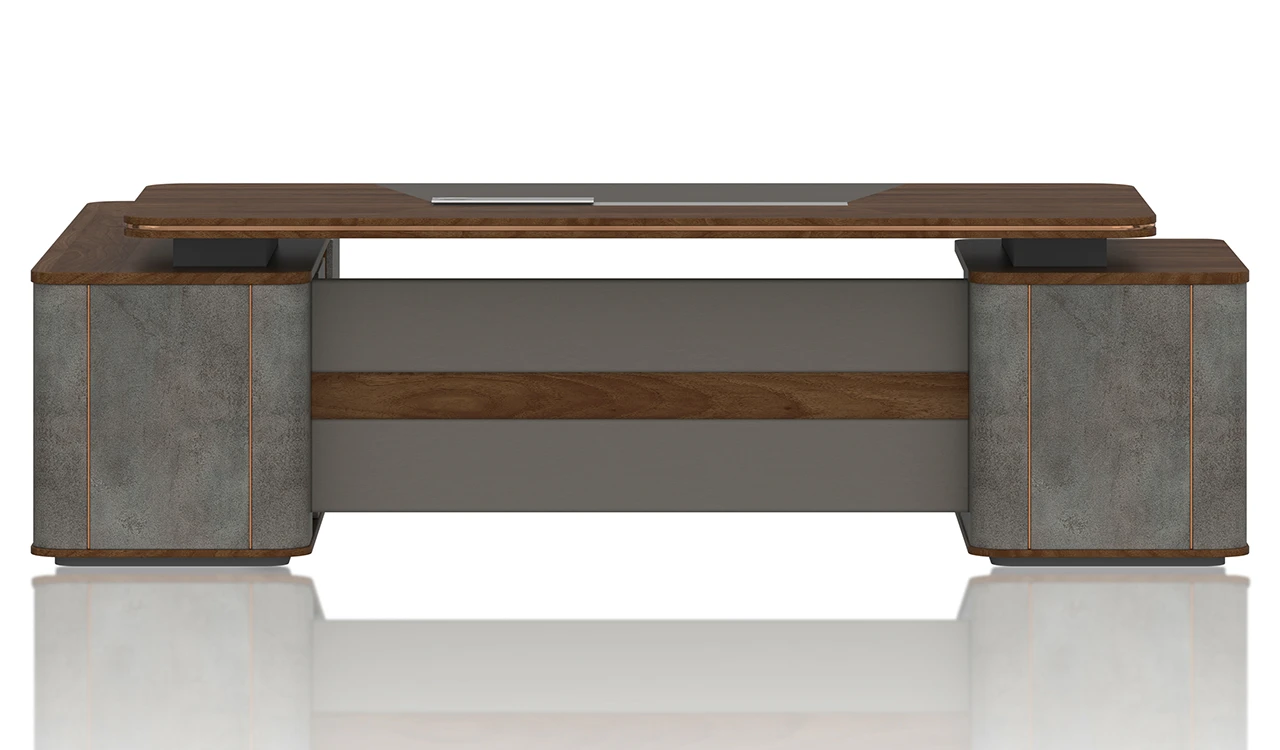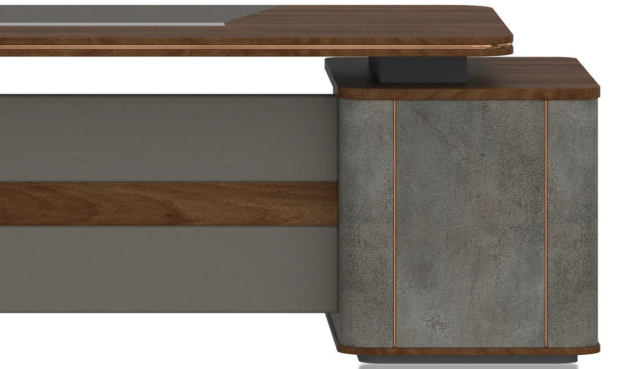 This elegant 7 feet office table with side cabinet comes in classic Norica walnut, rock gray and carbon gray combination as seen in the picture.