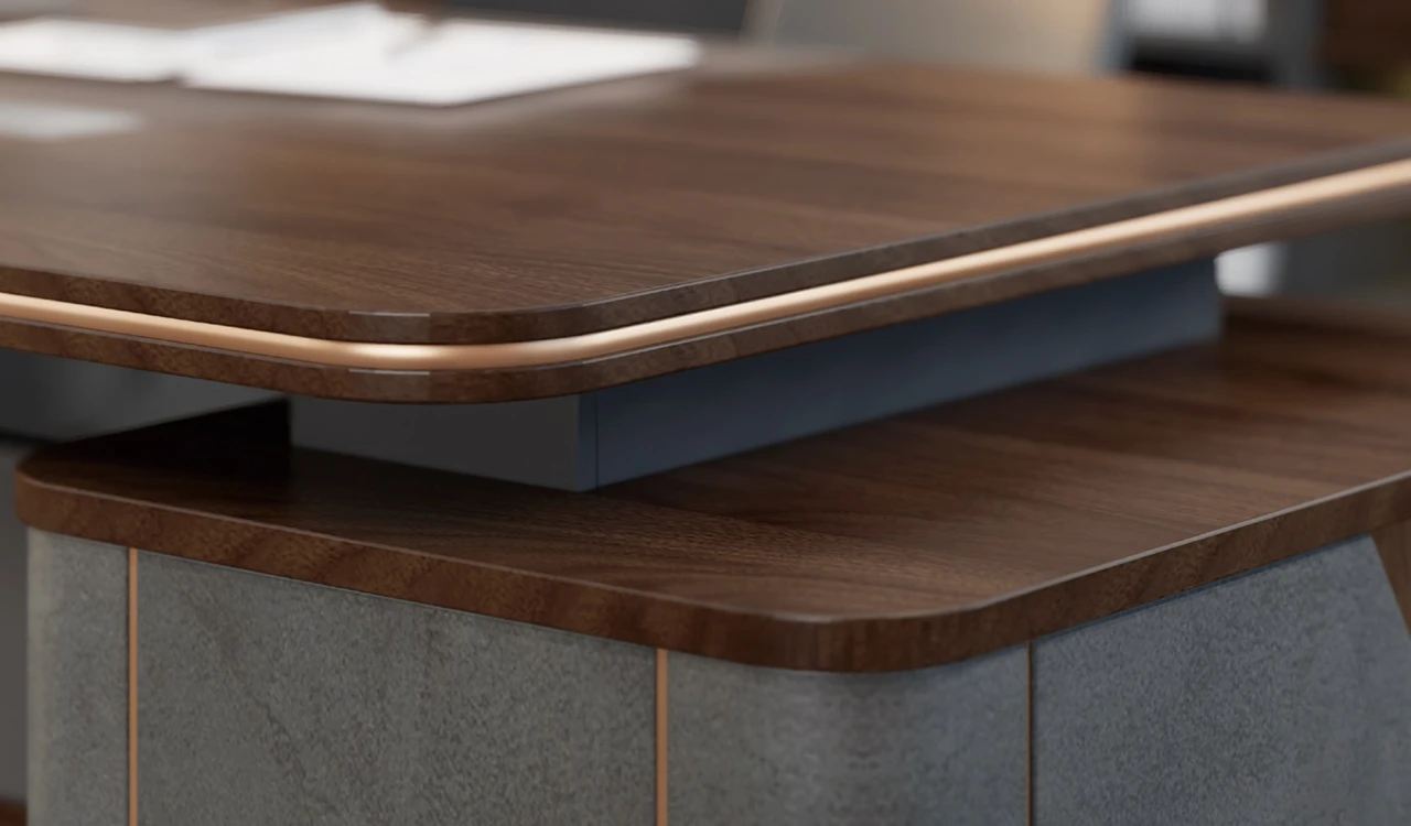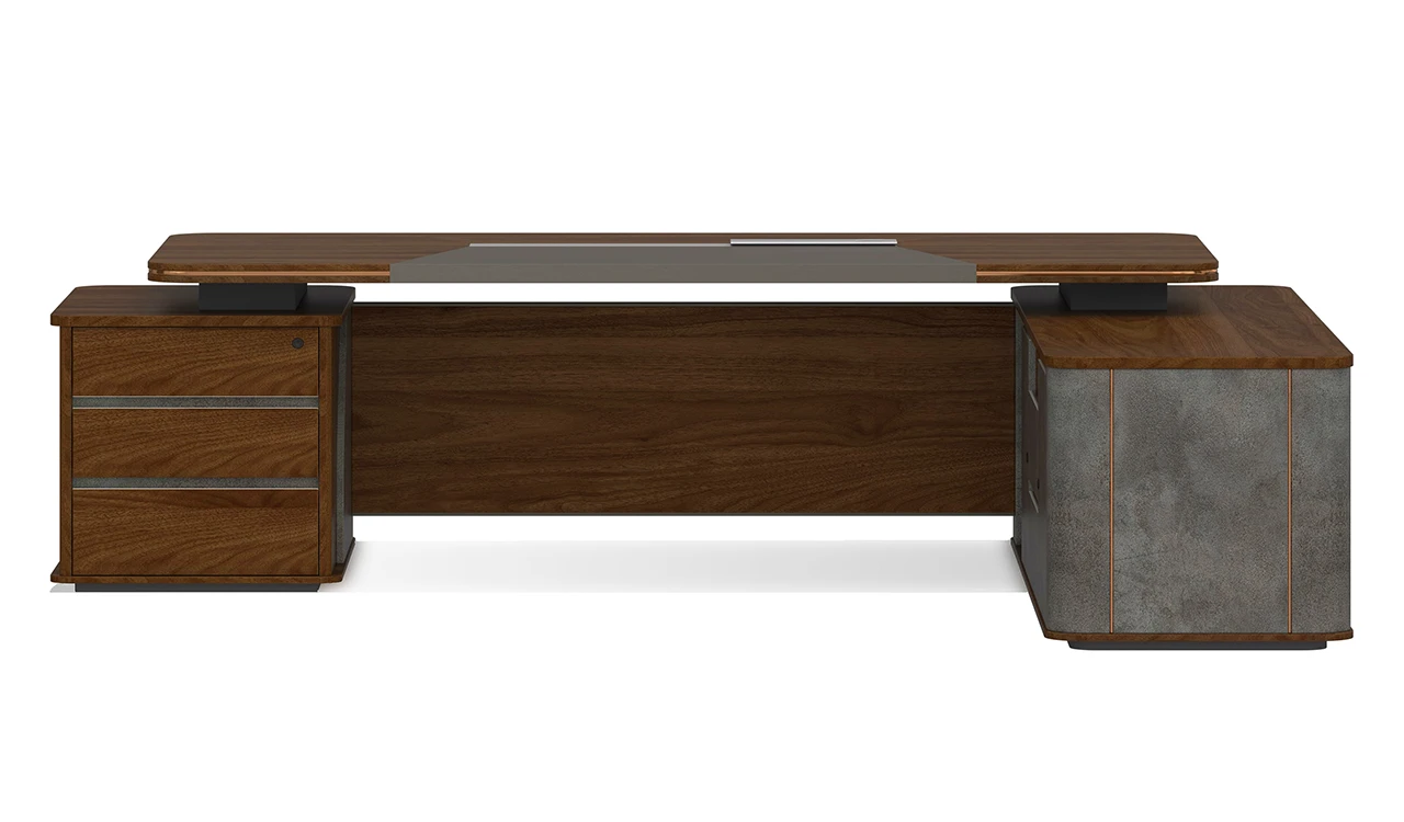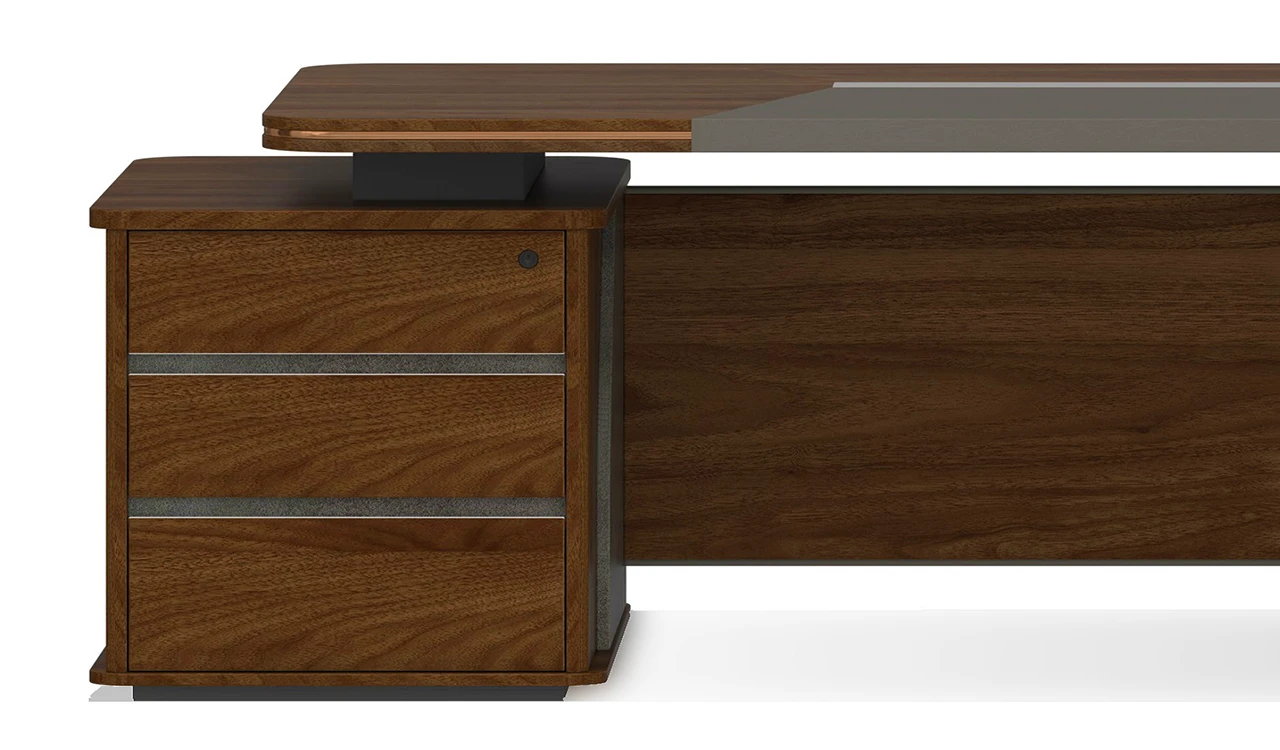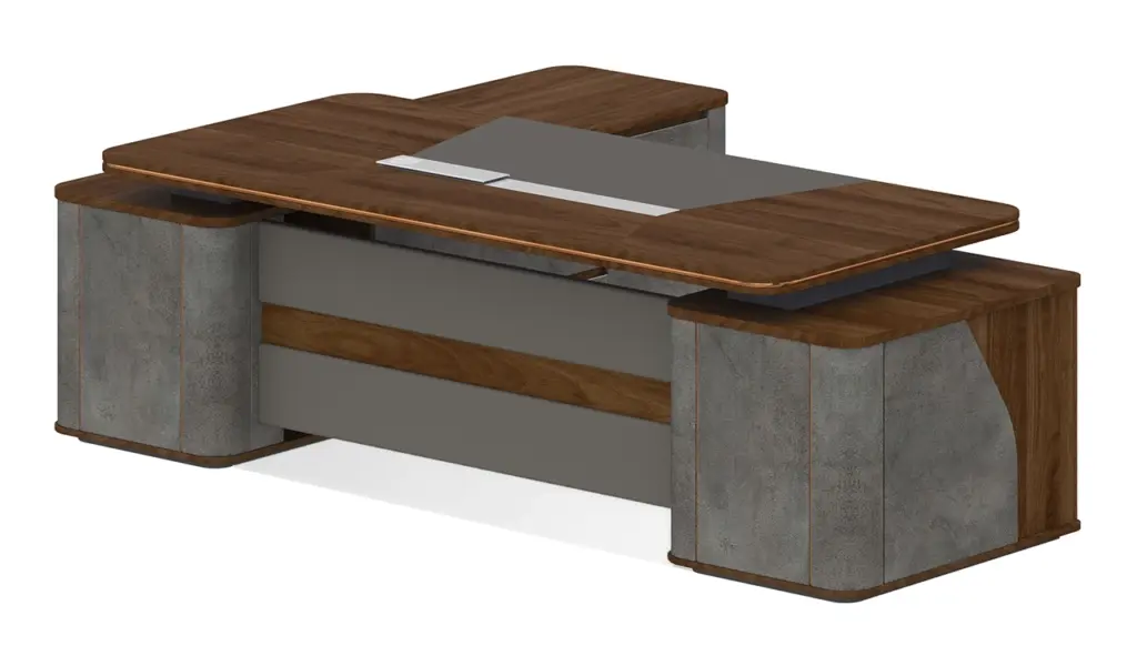 This elegant 7 feet office table with side cabinet comes in classic Norica walnut, rock gray and carbon gray combination as seen in the picture.