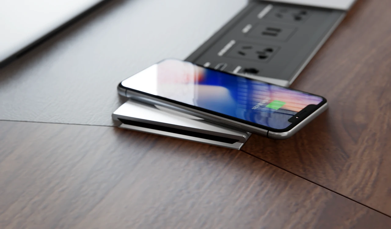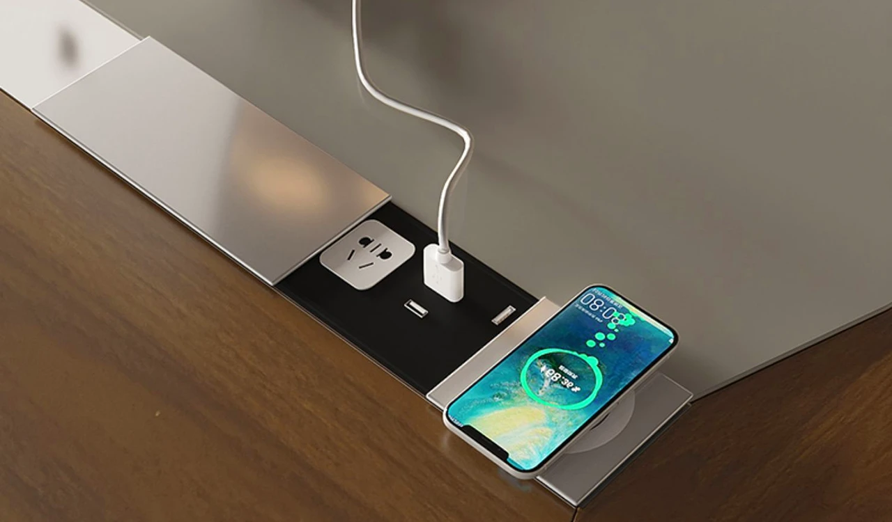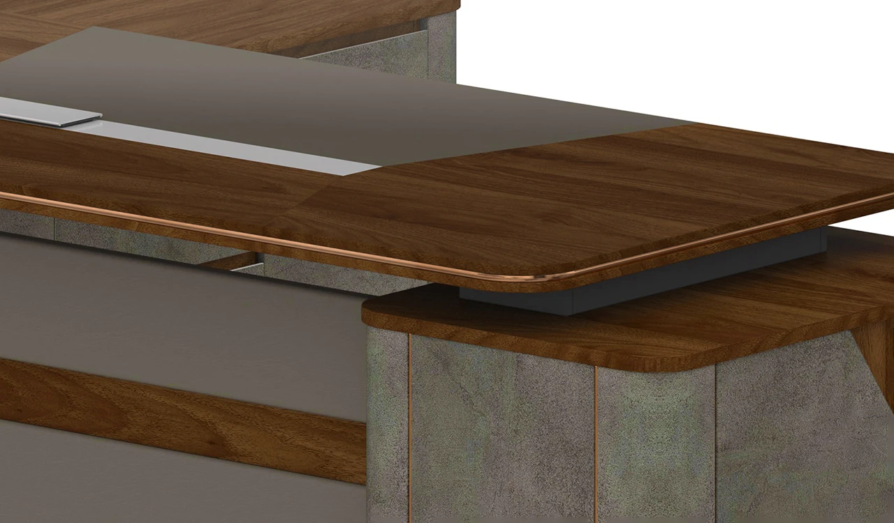 The 7-feet width Inspira Series office desk blends classical elegance and functionality with a rich Norica walnut & rock-gray finish with pink gold accents. Designed with a side cabinet and rounded corners it features a spacious work surface with inlaid leather pad, pedestal storage with drawers, and a tech-integrated wirebox on the tabletop with power outlets and wireless charging station. A perfect choice for an elegantly designed office.