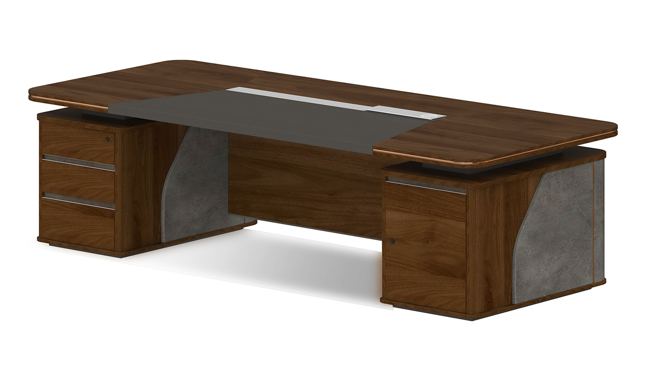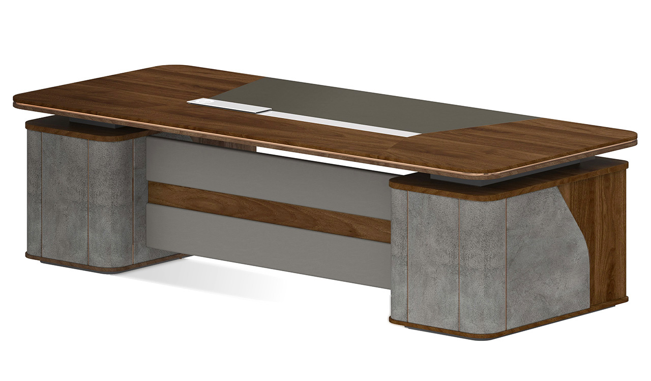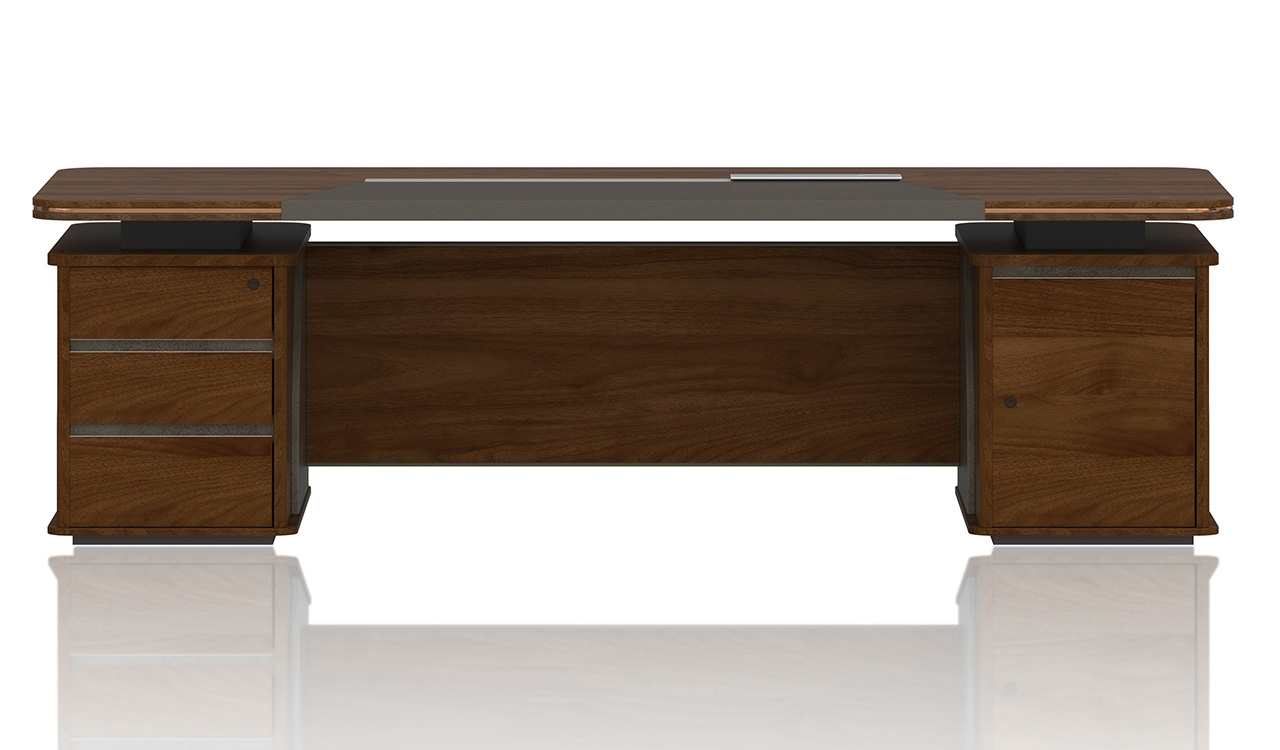 The 8-feet width Inspira Series office desk blends classical elegance and functionality with a rich Norica walnut & rock-gray finish with pink gold accents. Designed with two pedestals with drawers and rounded corners it features a spacious work surface with inlaid leather pad and a tech-integrated wirebox on the tabletop with power outlets and wireless charging station. A perfect choice for an elegantly designed office.
