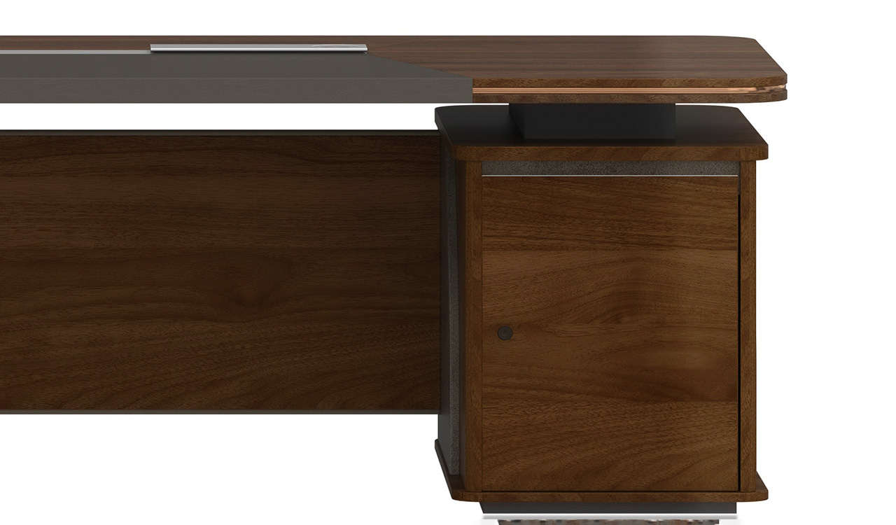 Office desk in 8 feet width with storage pedestal made with environment grade engineered wood and walnut laminate. The E1 grade MDF is a highly durable material and a world standard for premium office furniture while the walnut laminate is from our carefully selected range of premium laminates with consistent color and grain structure.