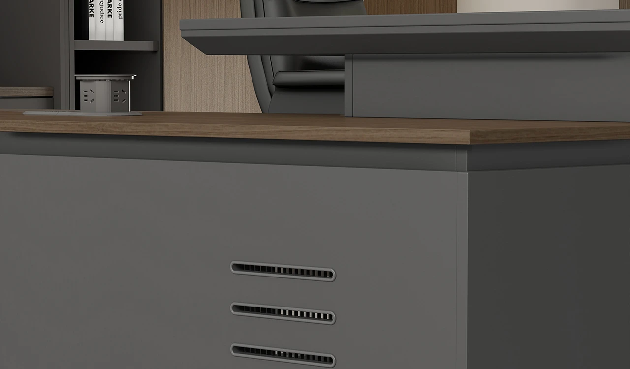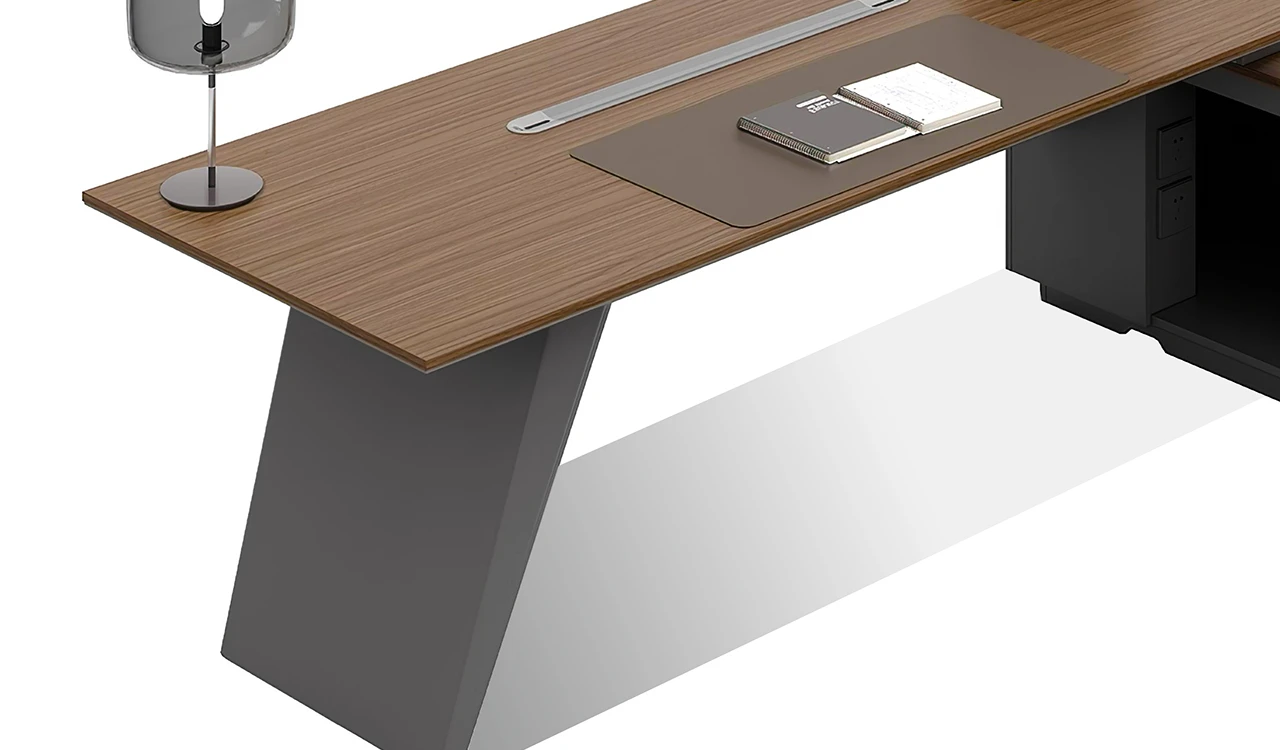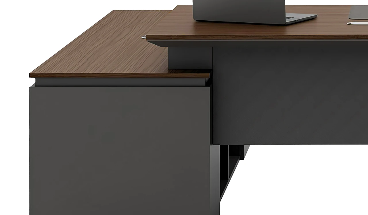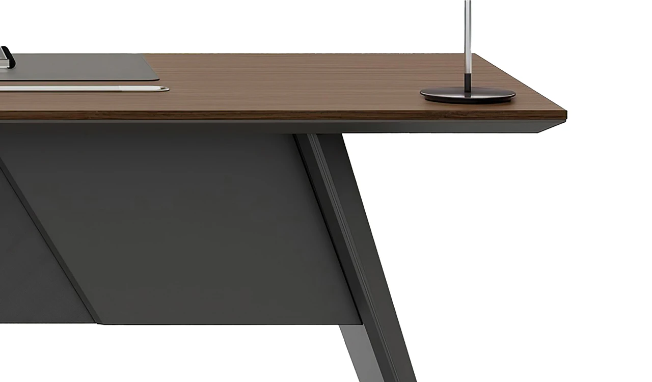 This 8 feet executive L-shaped desk blends architectural form with premium functionality. Its angled panel legs and asymmetrical privacy panel create a striking silhouette, while the dual-tone tabletop with chamfered edges adds a touch of sophistication. Designed with side cabinet with number lock drawers, inbuilt wire-management grommets and power sockets under the top it pairs seamlessly with all Vistra Series products.