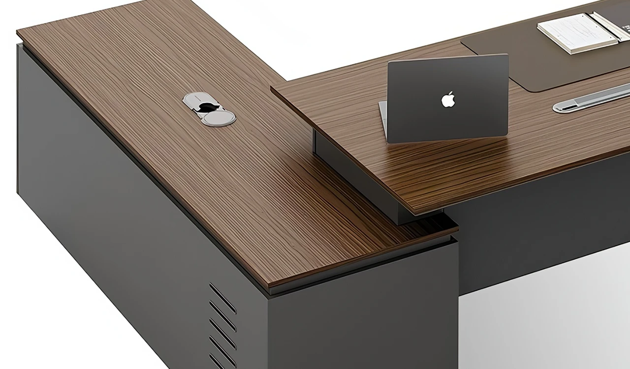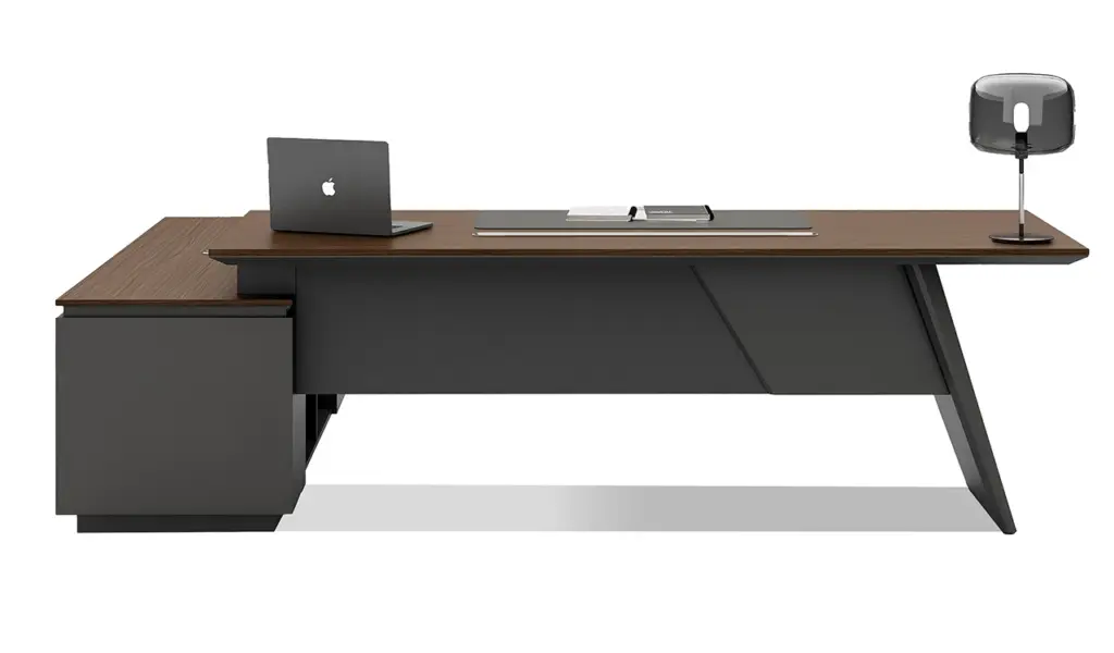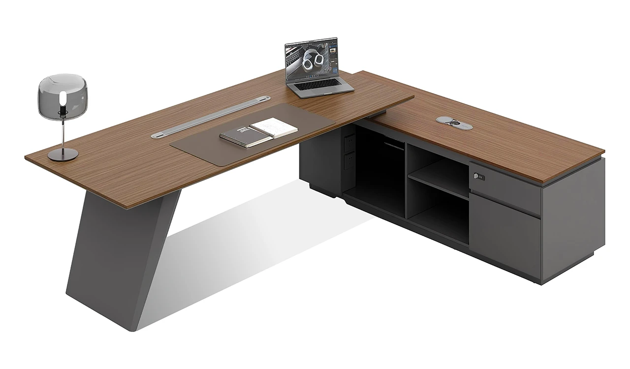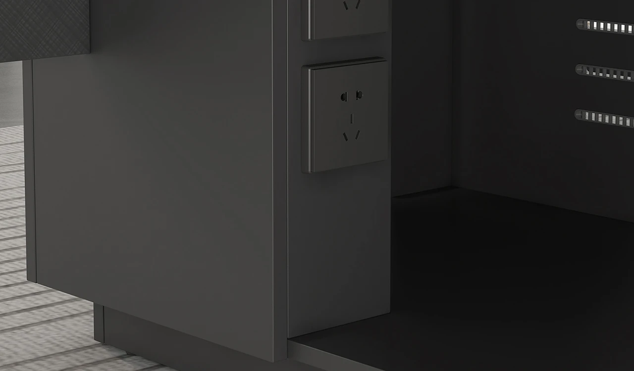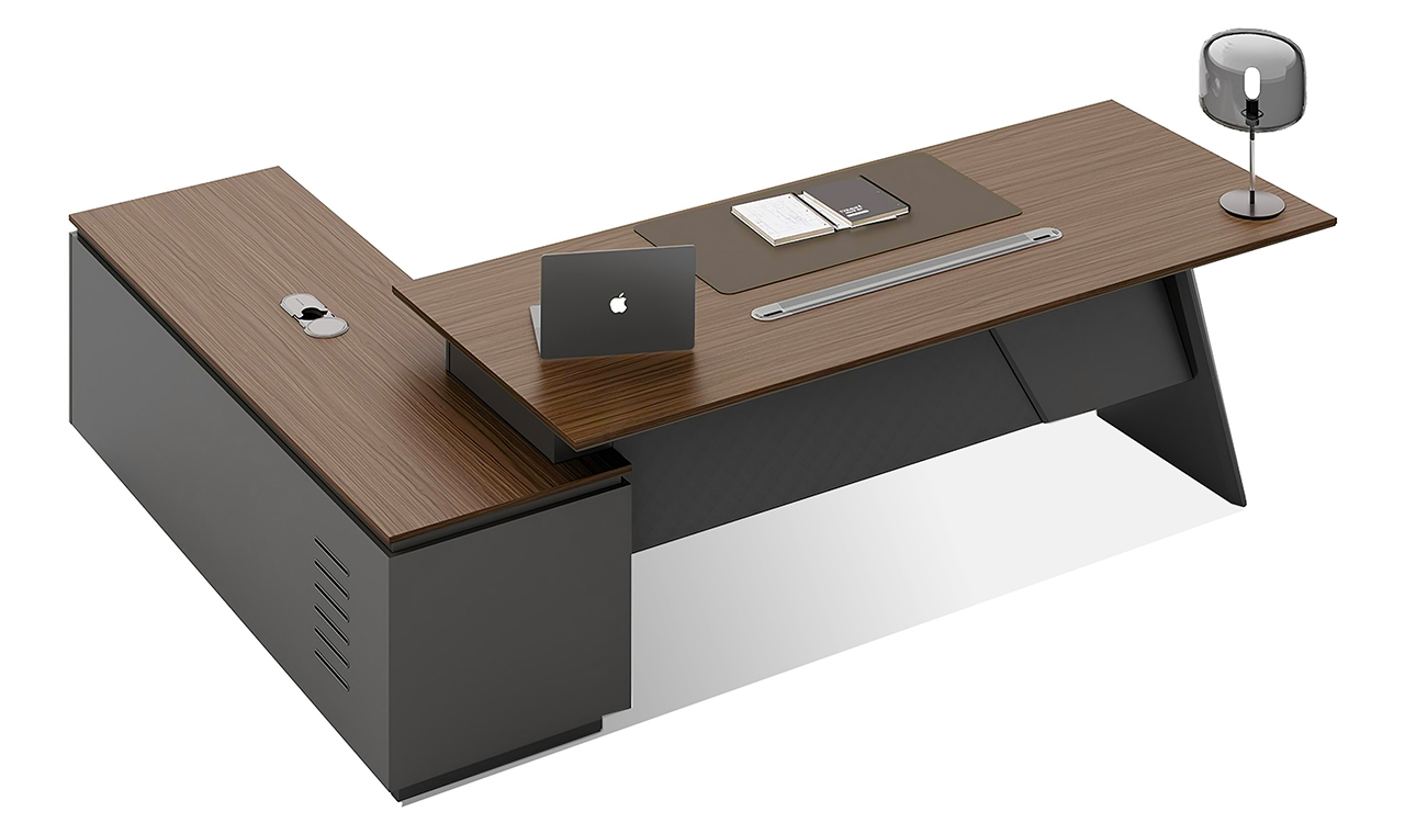 This 8 feet executive L-shaped desk blends architectural form with premium functionality. Its angled panel legs and asymmetrical privacy panel create a striking silhouette, while the dual-tone tabletop with chamfered edges adds a touch of sophistication. Designed with side cabinet with number lock drawers, inbuilt wire-management grommets and power sockets under the top it pairs seamlessly with all Vistra Series products.