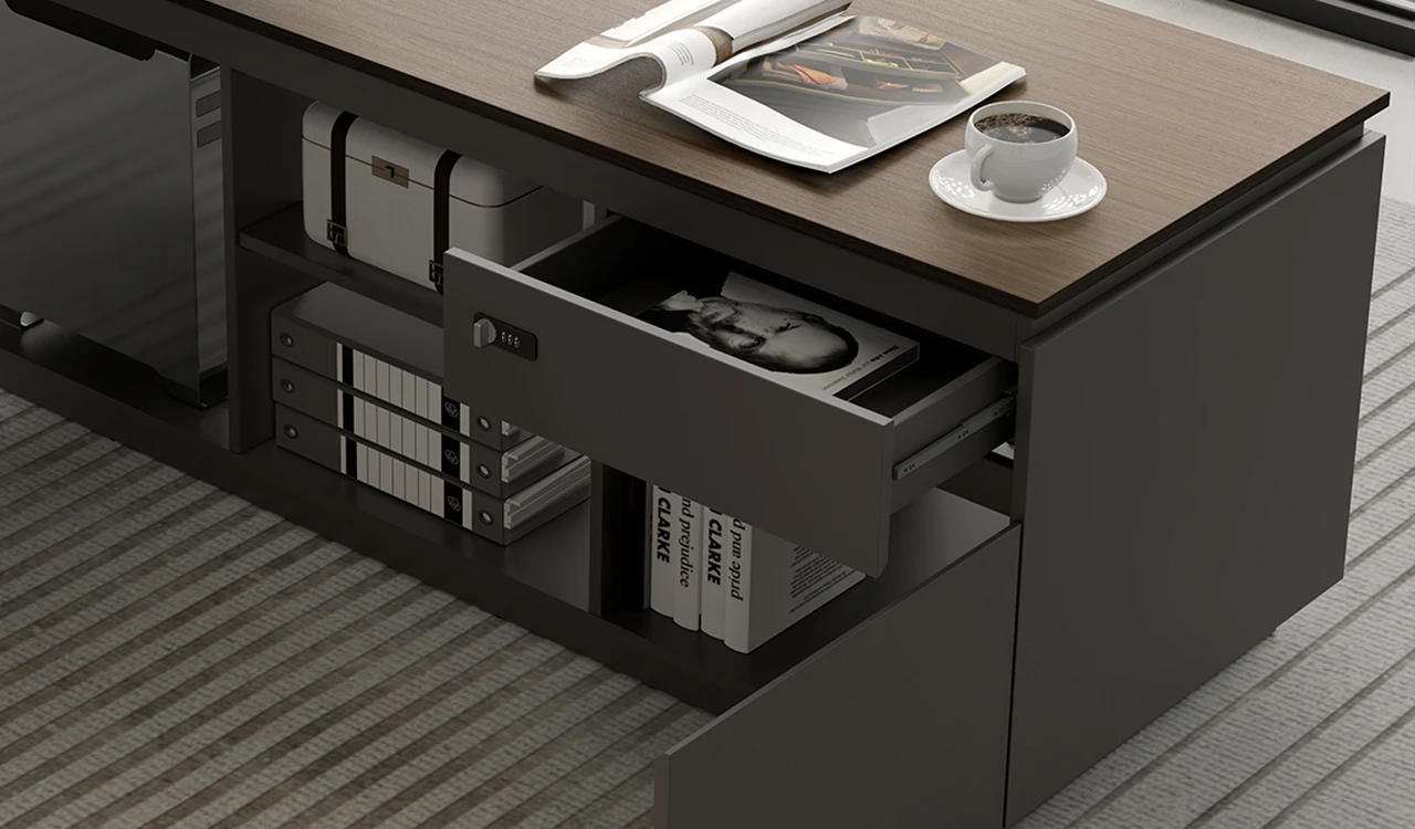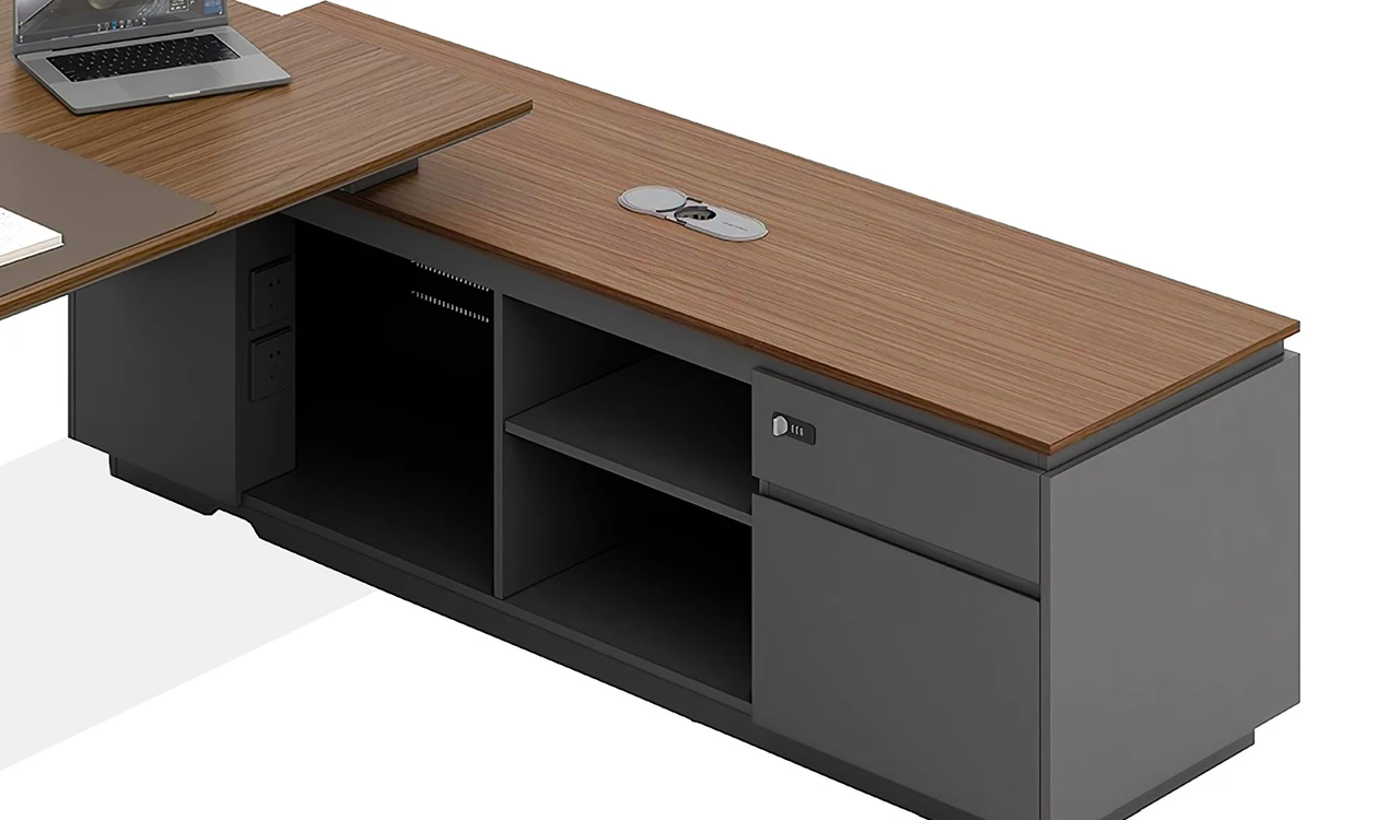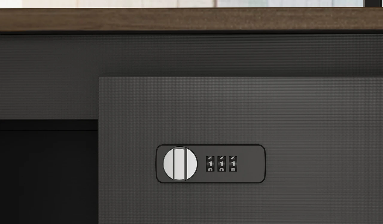 1. Tabletop in walnut laminate. 2. Side cabinet with inbuilt wirebox and number lock. 3. Tabletop with integrated wire routing grommet.