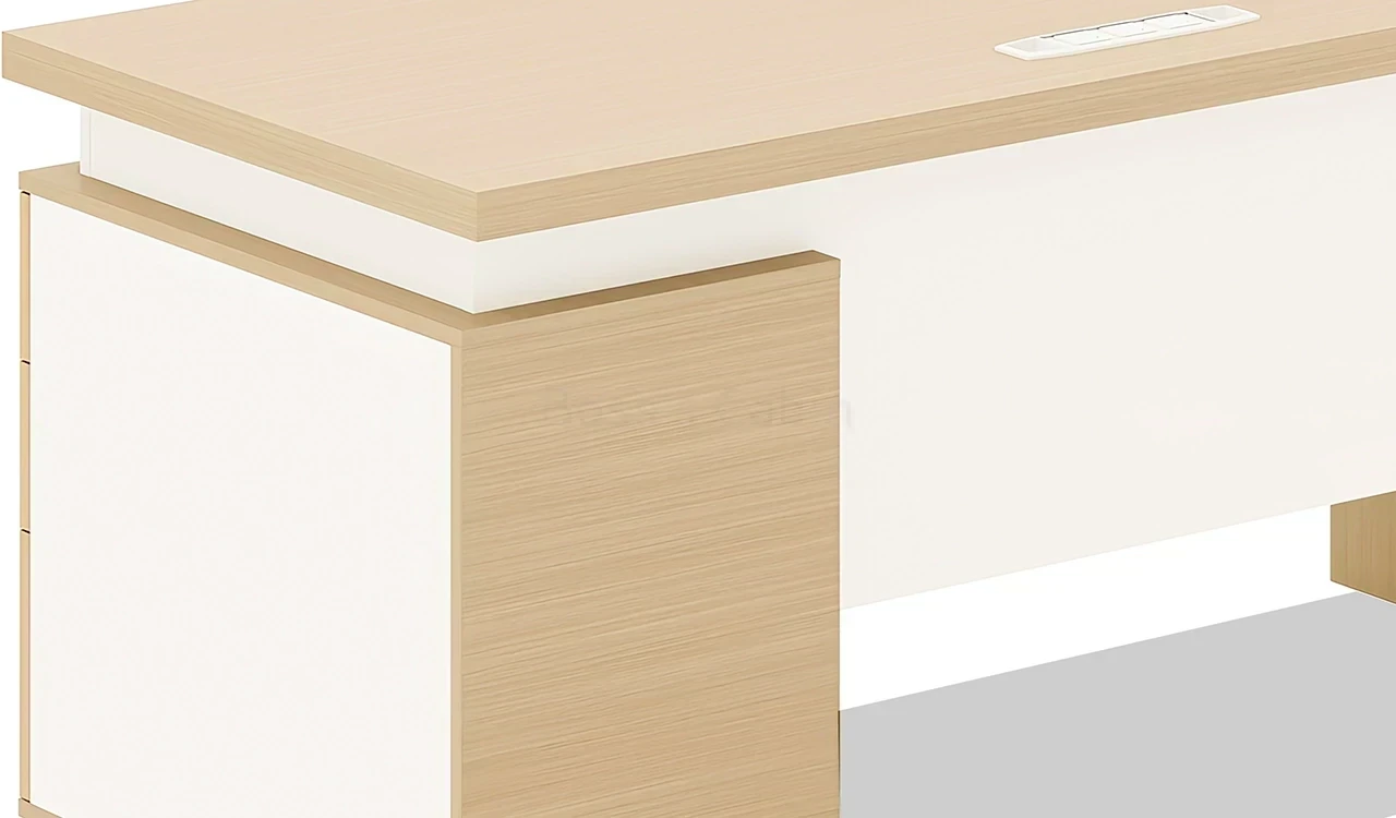 This modern, mid size office desk is designed with straight architectural lines. Its chamfered edge tabletop in beige walnut laminate features inward an integrated wire-routing grommet for a sleek, functional design. The side cabinet offers secure storage with a number lock and power socket provision for cable management. A solid white inset modesty panel adds visual depth, completing the desk’s refined, professional vibe. Pairs seamlessly with all Plex Series products.