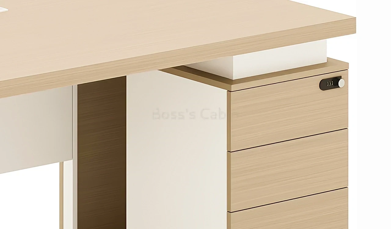 Part of the Plex series this elegant 5 feet width office desk comes with a three drawer storage pedestal. It is best suited for small cabins of 75 sft and upward.