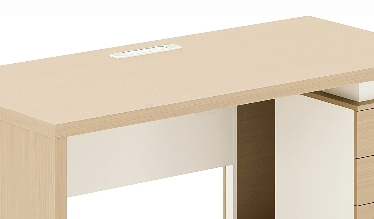1. Tabletop in beige walnut laminate. 2. Storage drawers with number lock. 3. Tabletop with integrated wire routing grommet.