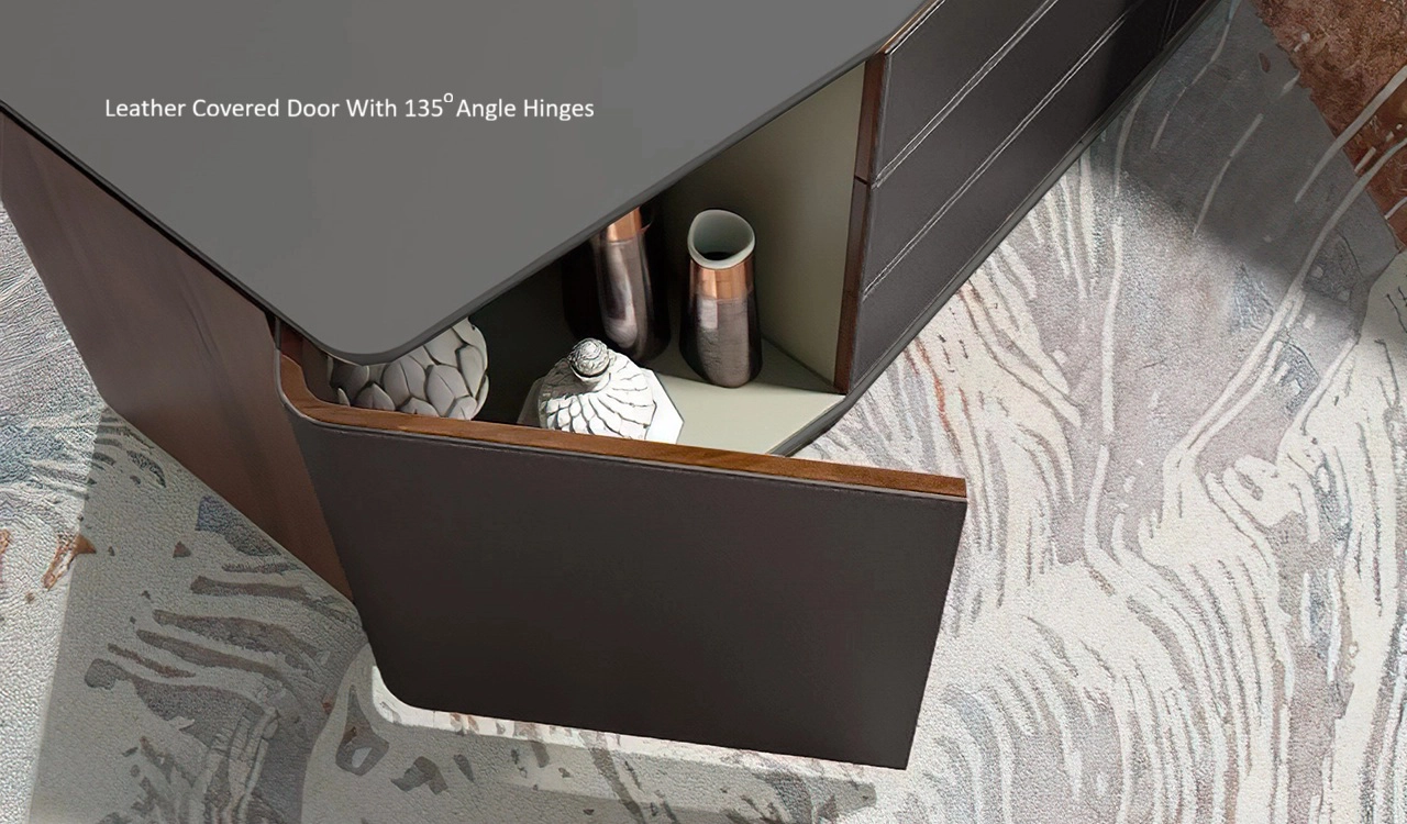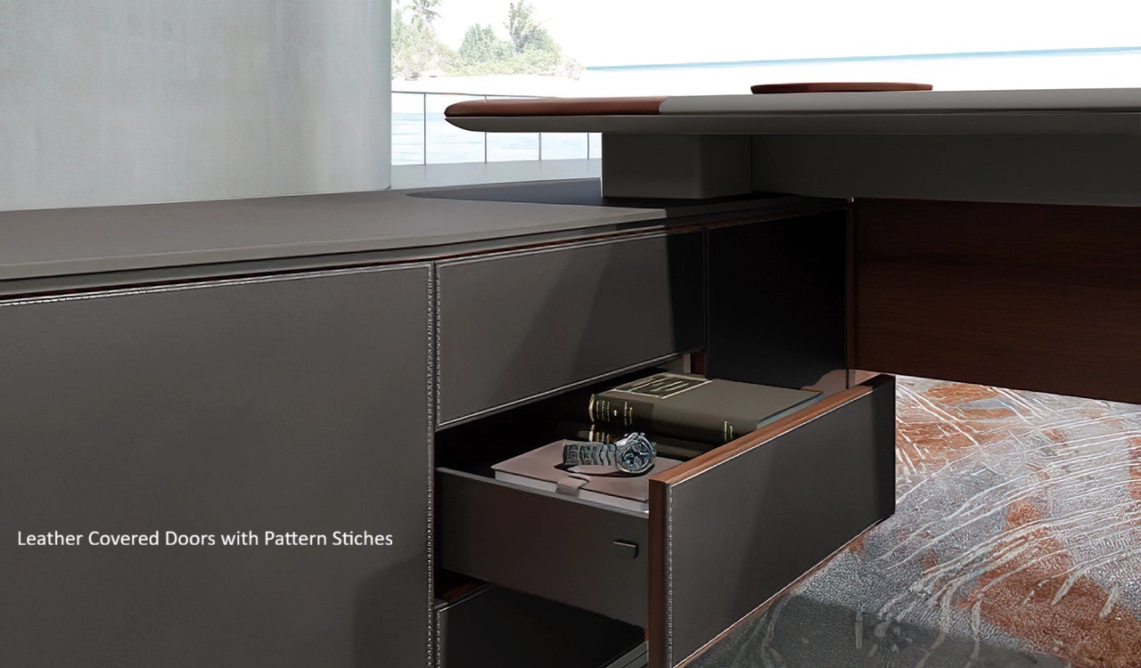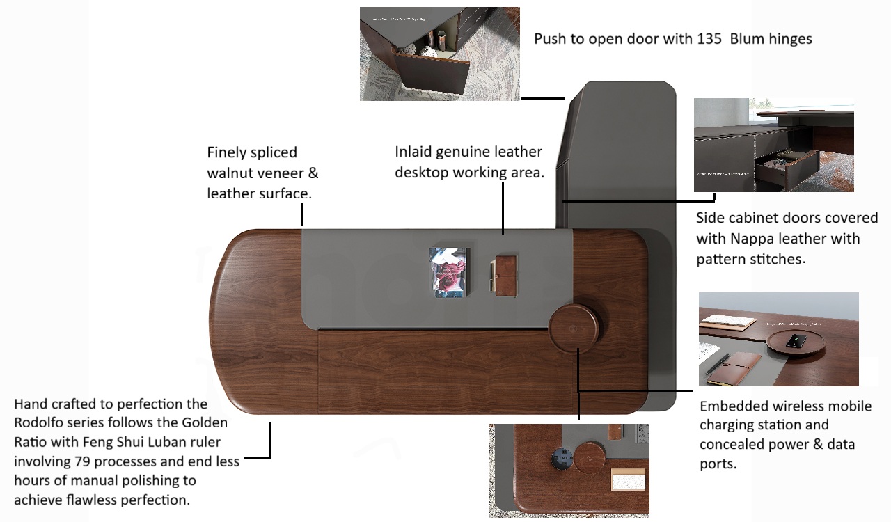 A hand-crafted masterpiece, the Rodolfo Series 9 feet desk is finished in rich open pore dark walnut veneer accented with dark gray leather & lacquer. The Nappa leather covered side cabinet, leg and desktop are made using upholstery technique used for interiors of Aston Martin. Includes an inbuilt wire routing system with a concealed wirebox integrated on tabletop featuring power, internet CAT.6, HDMI & USB ports. Also included is an embedded wireless charger on tabletop. The side cabinet comes with soft closing Hettich and Blum hardware. A perfect choice for a plush office.