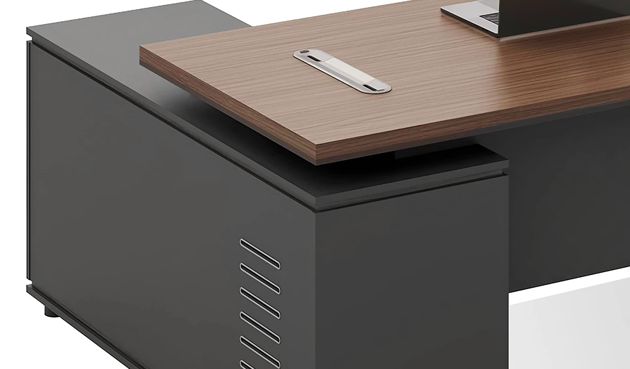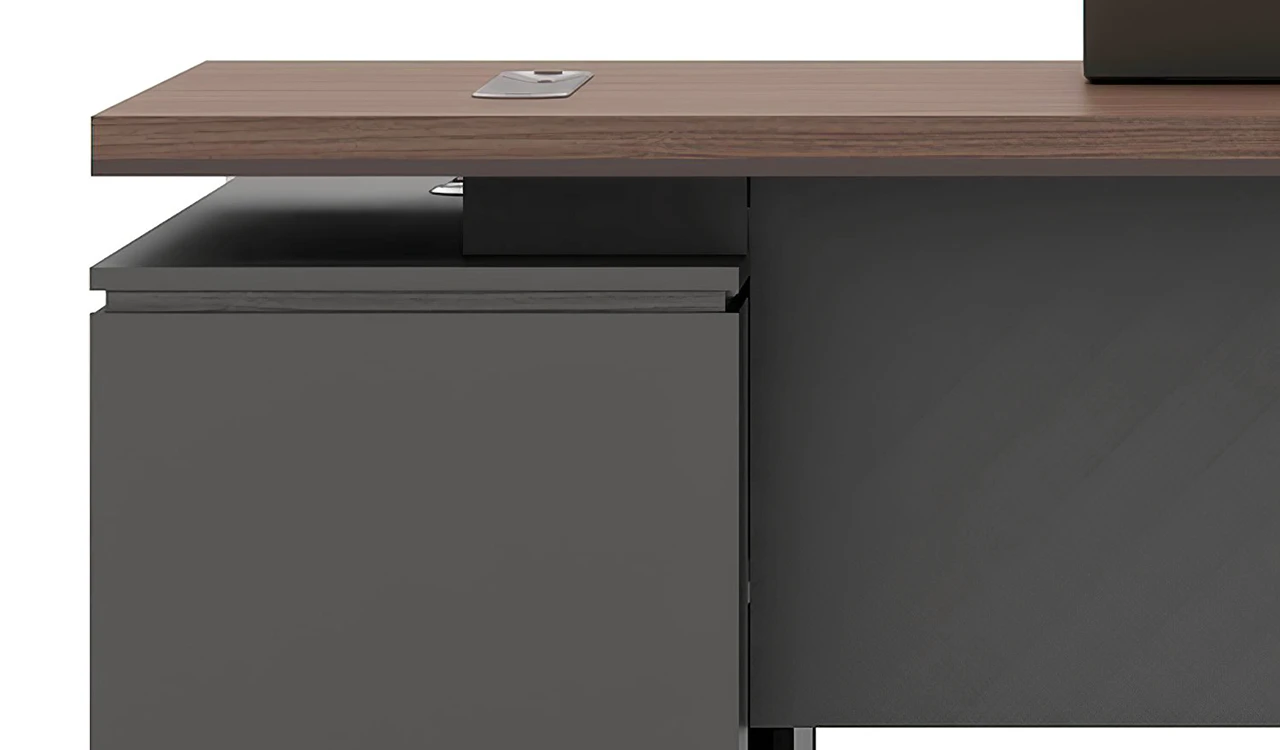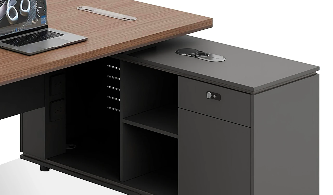 1. Tabletop in Asti Walnut and Advanced Gray laminate. 2. Side cabinet with inbuilt wirebox, wireless mobile charger and number lock. 3. Tabletop with integrated wire routing grommet.