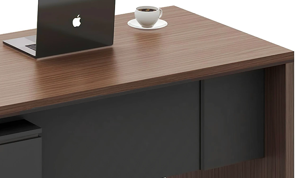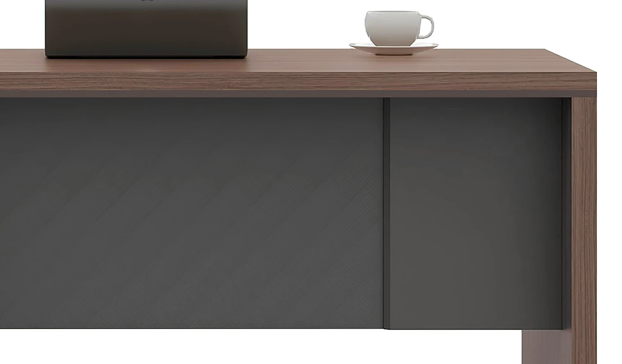 A compact modern office desk suitable for contemporary office interiors. The side cabinet has storage with number lock and an integrated wire management grommet. The dual tone finish desk is designed in Asti Walnut & Advanced Gray laminate with integrated wire routing grommet. The modesty panel on the front of the table is aesthtically designed in solid and textured gray tones . Pairs seamlessly with all Vistra Series products.