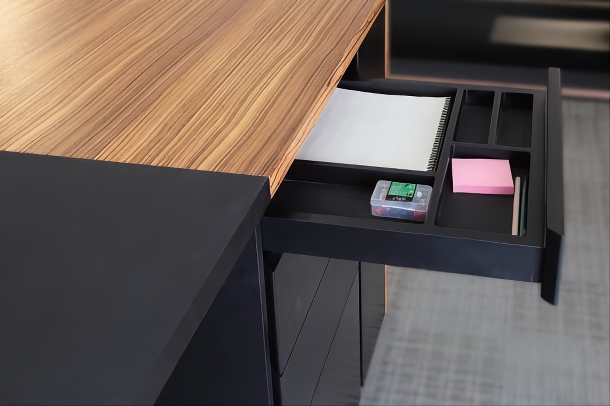 Main desk with inbuilt storage drawers, Hettich rebound sliders, FGV hinges, BMB locks and two hidden wireboxes with telephone, data and power ports.