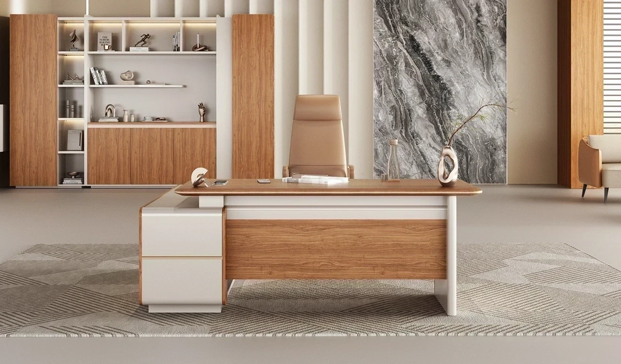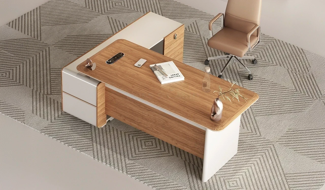 Office desk in 6.5 feet width with storage cabinet made with environment grade engineered wood and walnut laminate. The E0 grade MDF is a highly durable material and a world standard for premium office furniture while the sandal wood laminate is from our carefully selected range of premium laminates with consistent color and grain structure.
