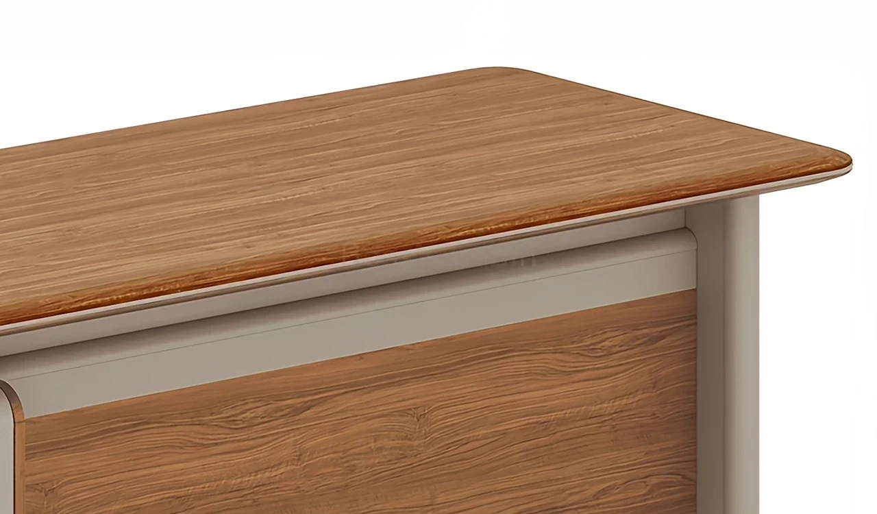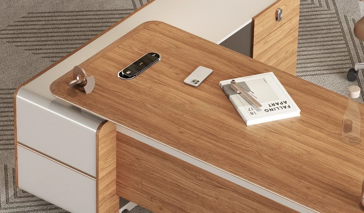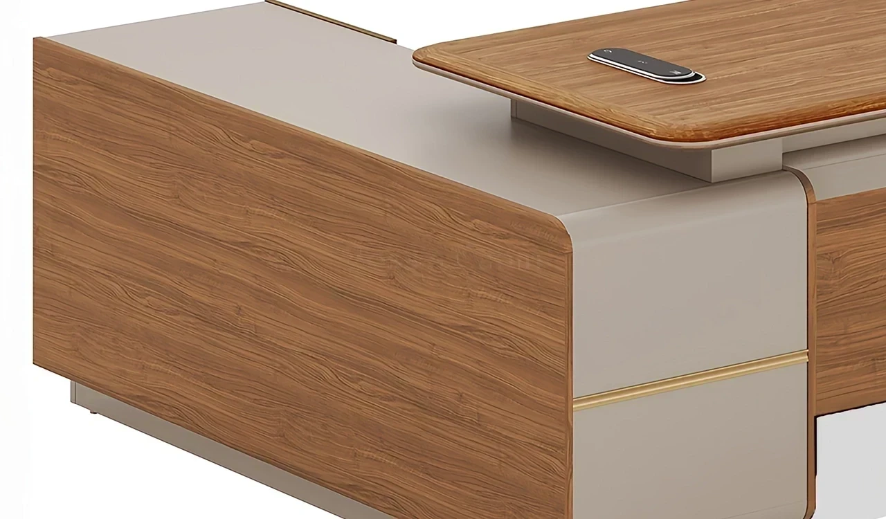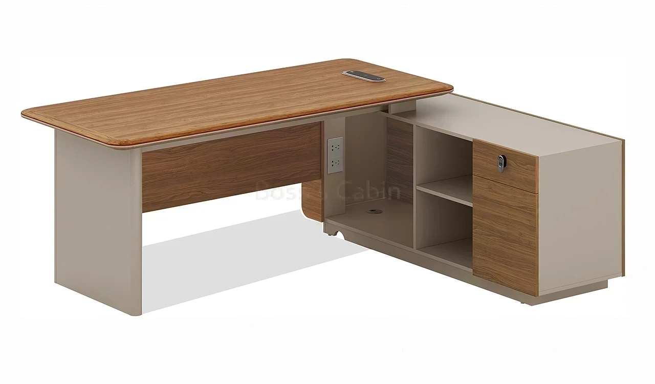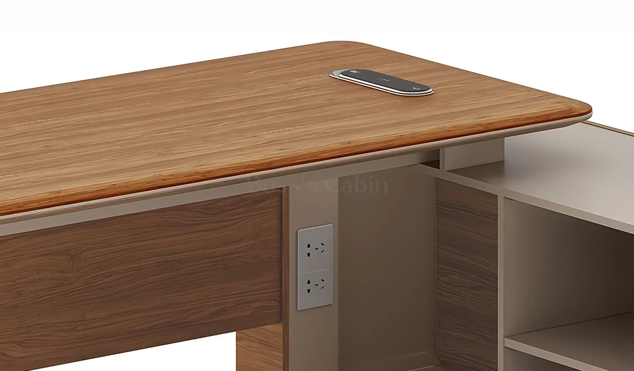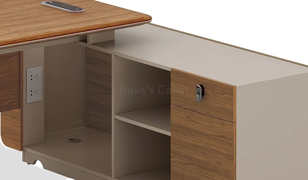 A compact office table in rich sandalwood and seagull gray laminate, featuring smoothly tapering beveled edged, rounded corner desktop. Includes a side cabinet having multiple storage shelves and number-lock on the drawer. The desktop includes an integrated power module while the integrated dual tone modesty panel elevates the over all design of the desk. Part of the Swan Series, its a great choice for medium size office cabins.