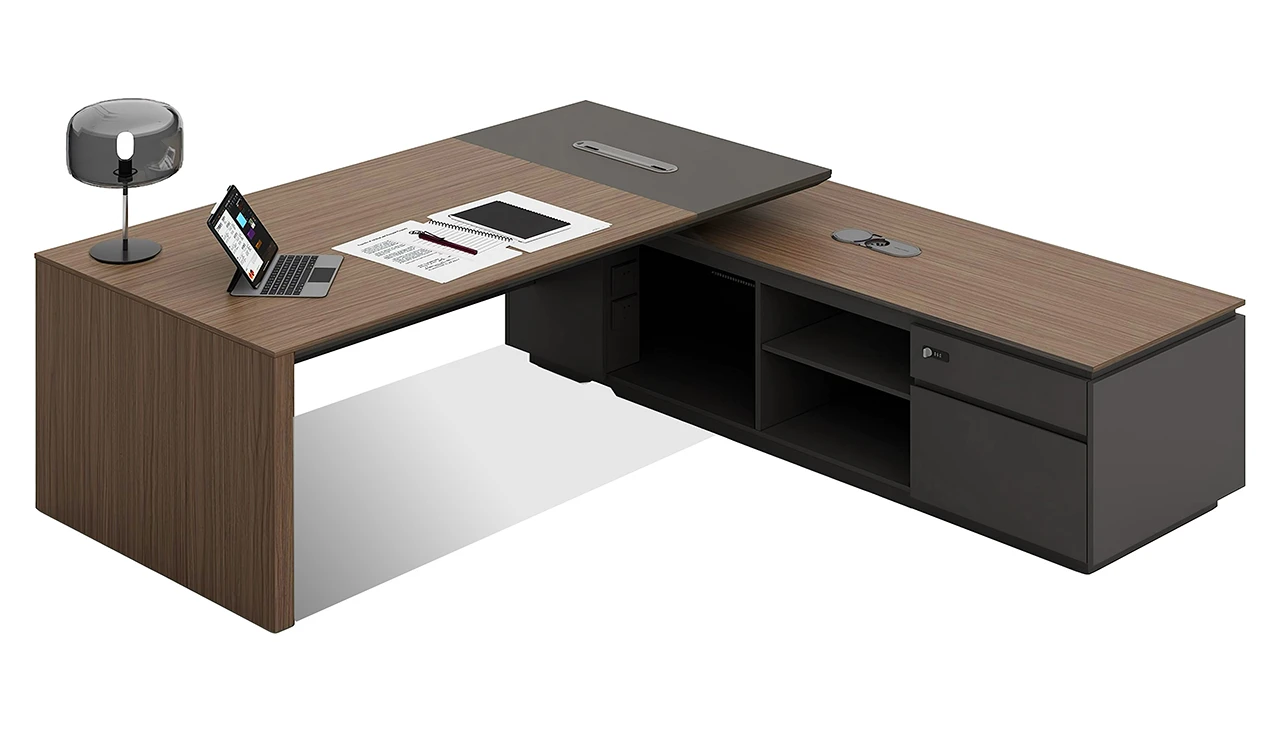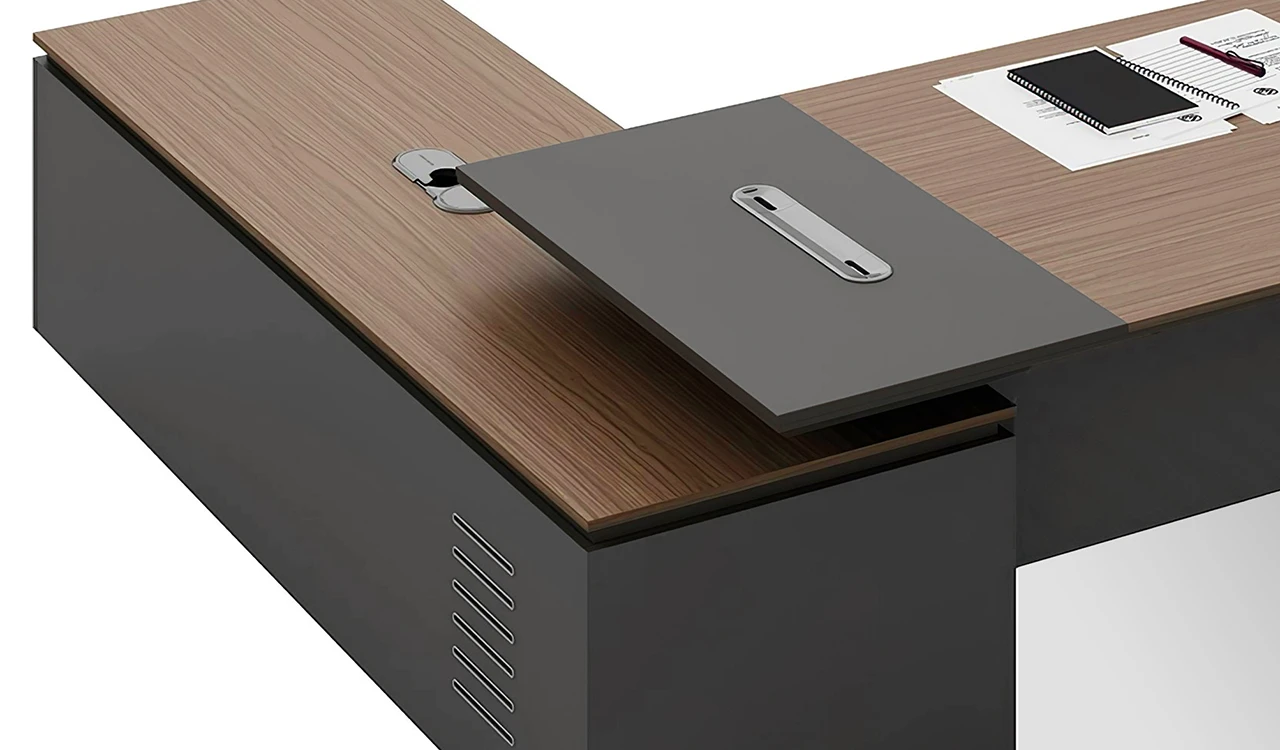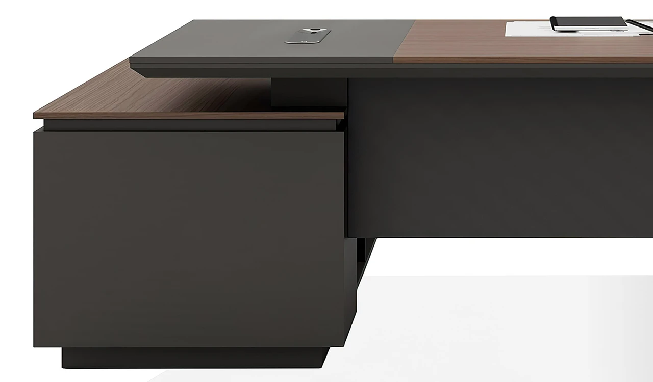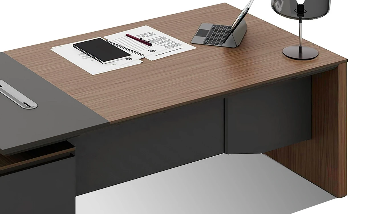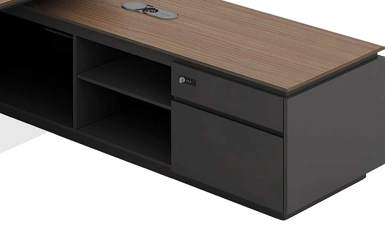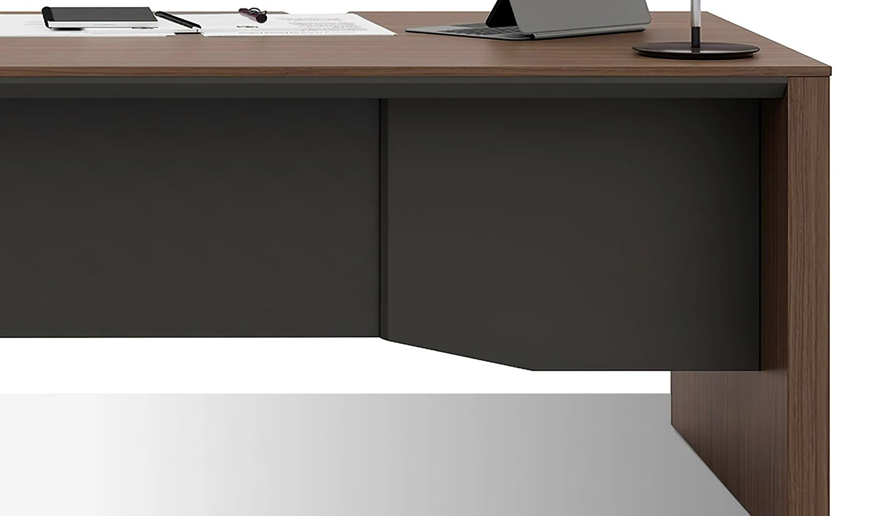 This modern 8 feet office desk is defined by clean geometric lines and a refined dual-tone finish in Asti Walnut and Advanced Gray laminate. The tabletop features inward chamfered edges and an integrated wire-routing grommet, blending sleek aesthetics with functionality. A side cabinet provides secure, number-lock storage and a built-in wirebox for seamless cable management. The front modesty panel, crafted in textured and solid gray tones, adds visual depth. Designed to pair effortlessly with all Vistra Series products.