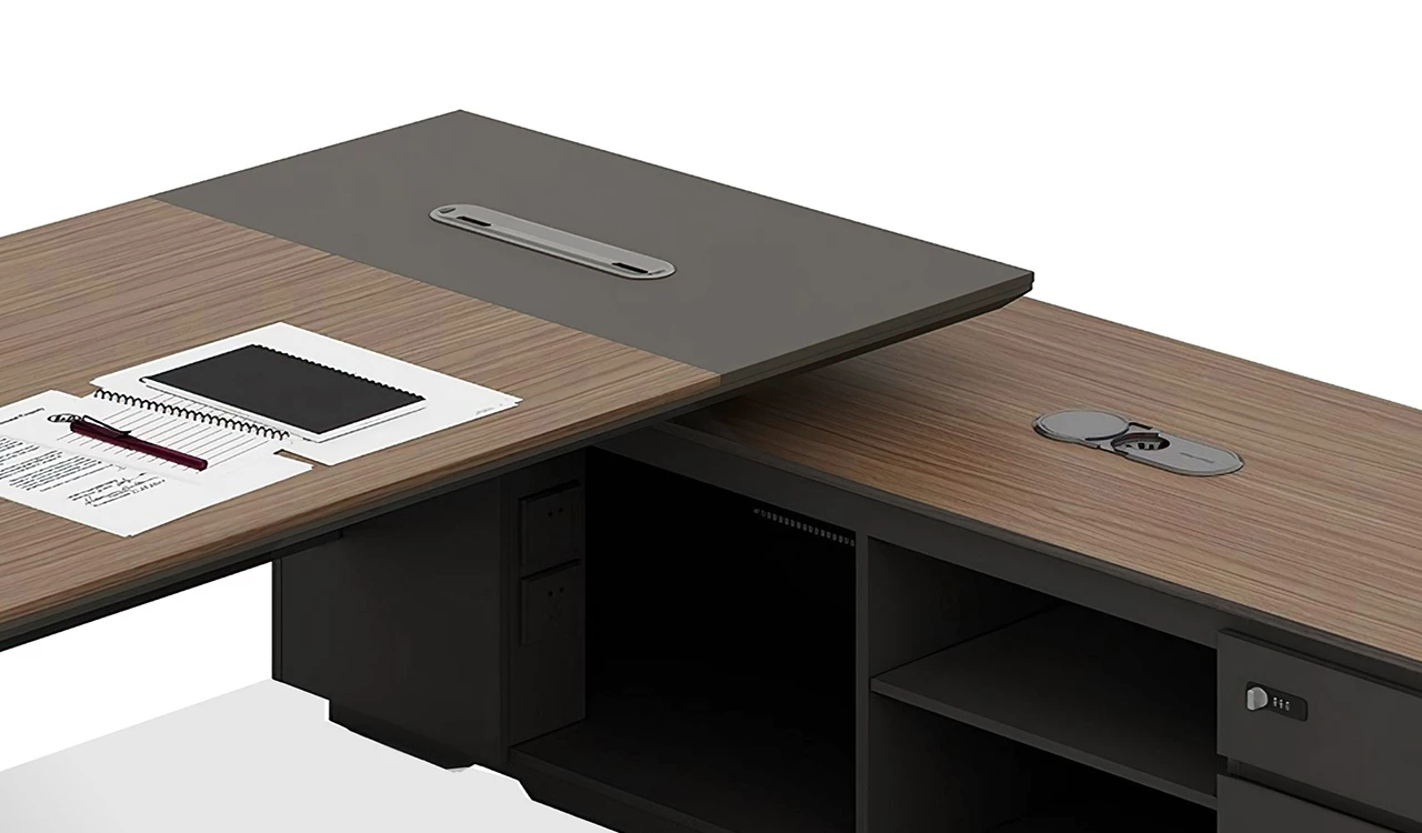 1. Tabletop in Asti Walnut and Advanced Gray laminate. 2. Side cabinet with inbuilt wirebox and number lock. 3. Tabletop with integrated wire routing grommet.
