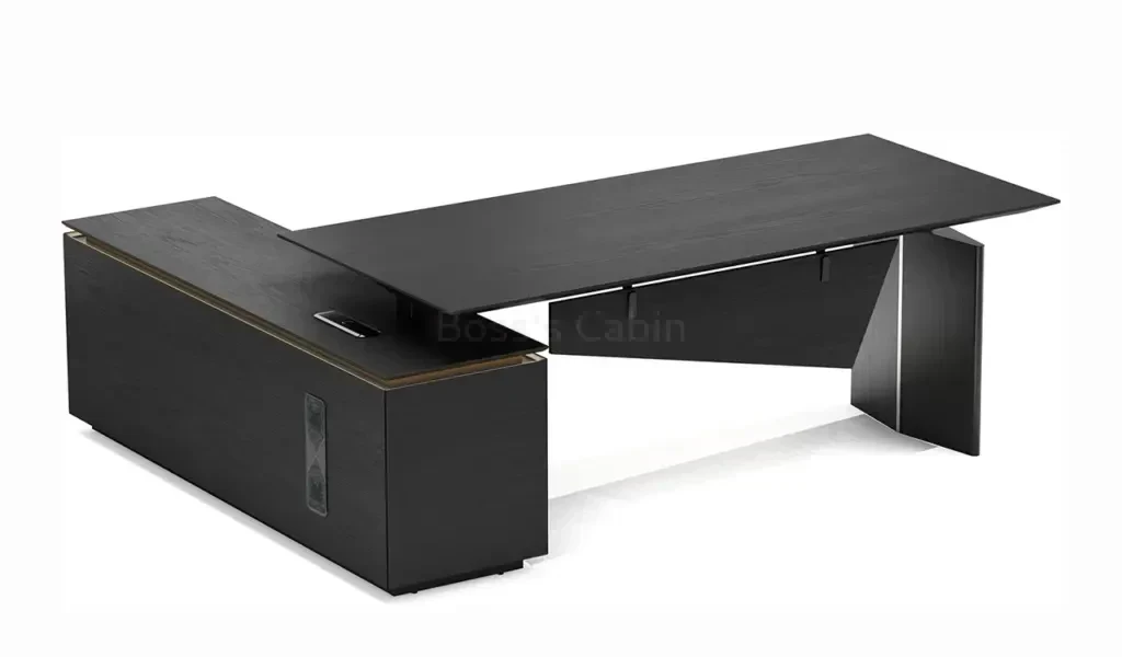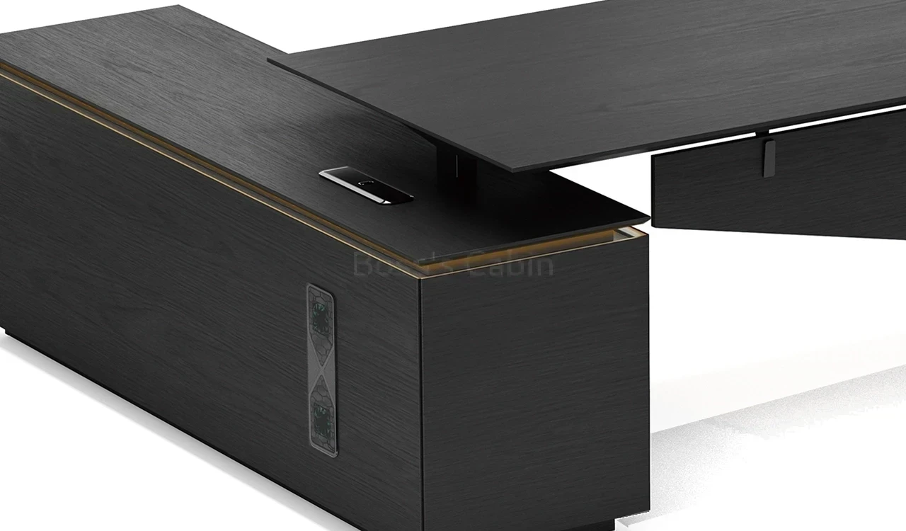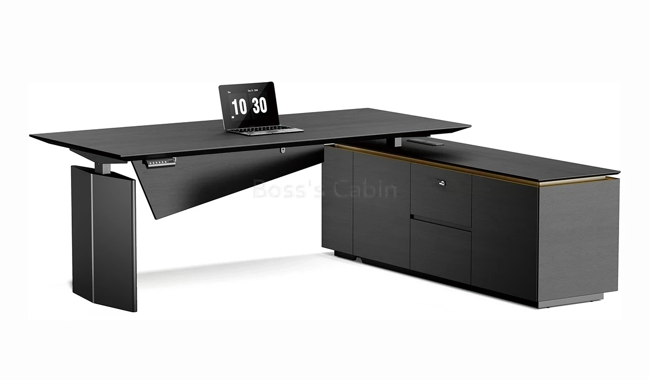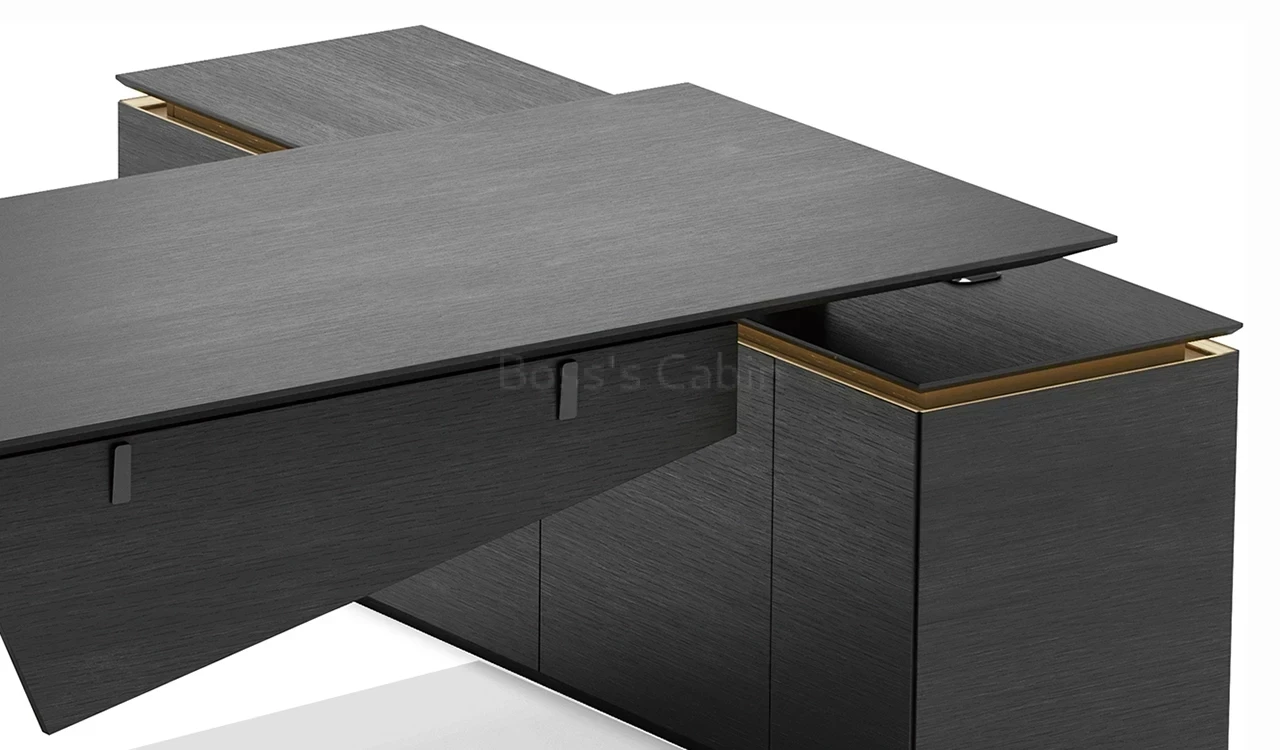 Office desk in 7 feet width with side cabinet made with environment grade engineered wood and black oak laminate. The E0 grade MDF is a highly durable material and a world standard for premium office furniture while the oak laminate is from our carefully selected range of premium laminates with consistent color and grain structure.