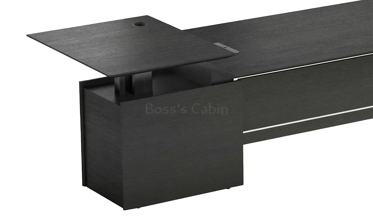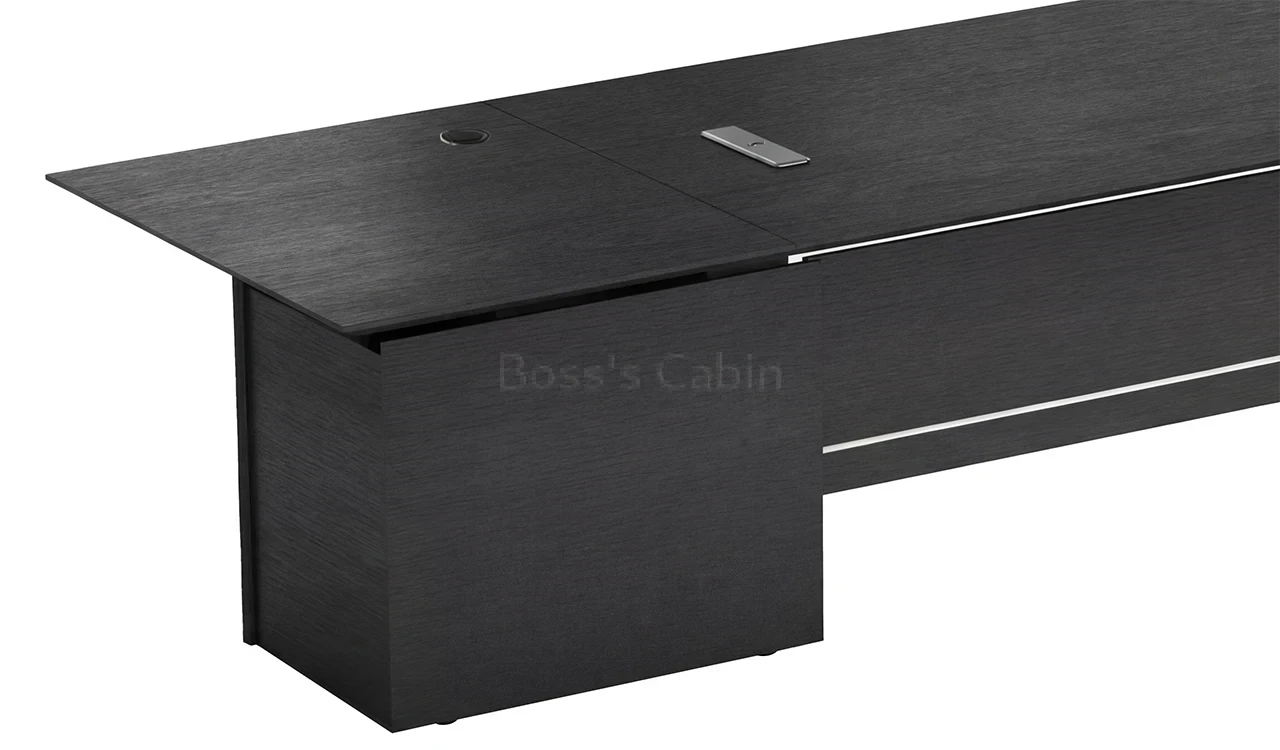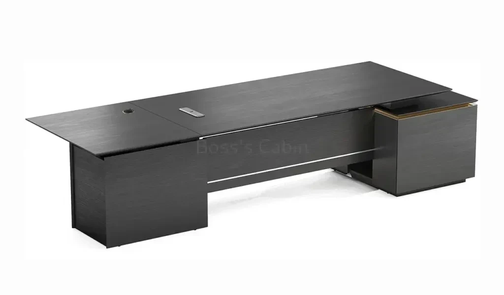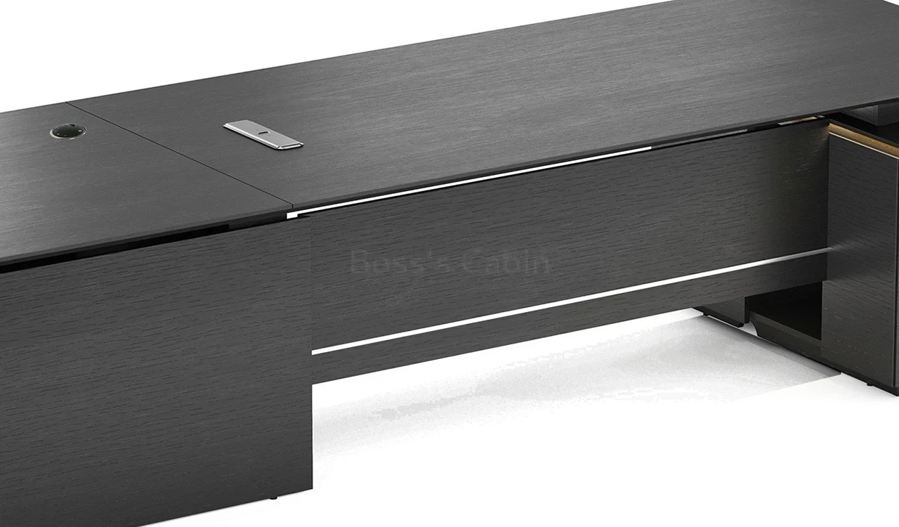 Office desk in 9 feet width with storage pedestals made with environment grade engineered wood and black oak laminate. The E0 grade MDF is a highly durable material and a world standard for premium office furniture while the oak laminate is from our carefully selected range of premium laminates with consistent color and grain structure.