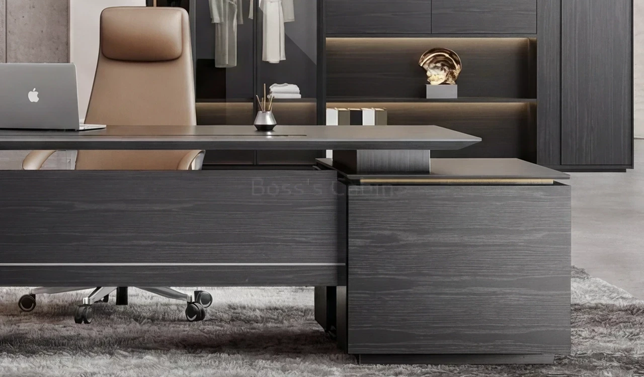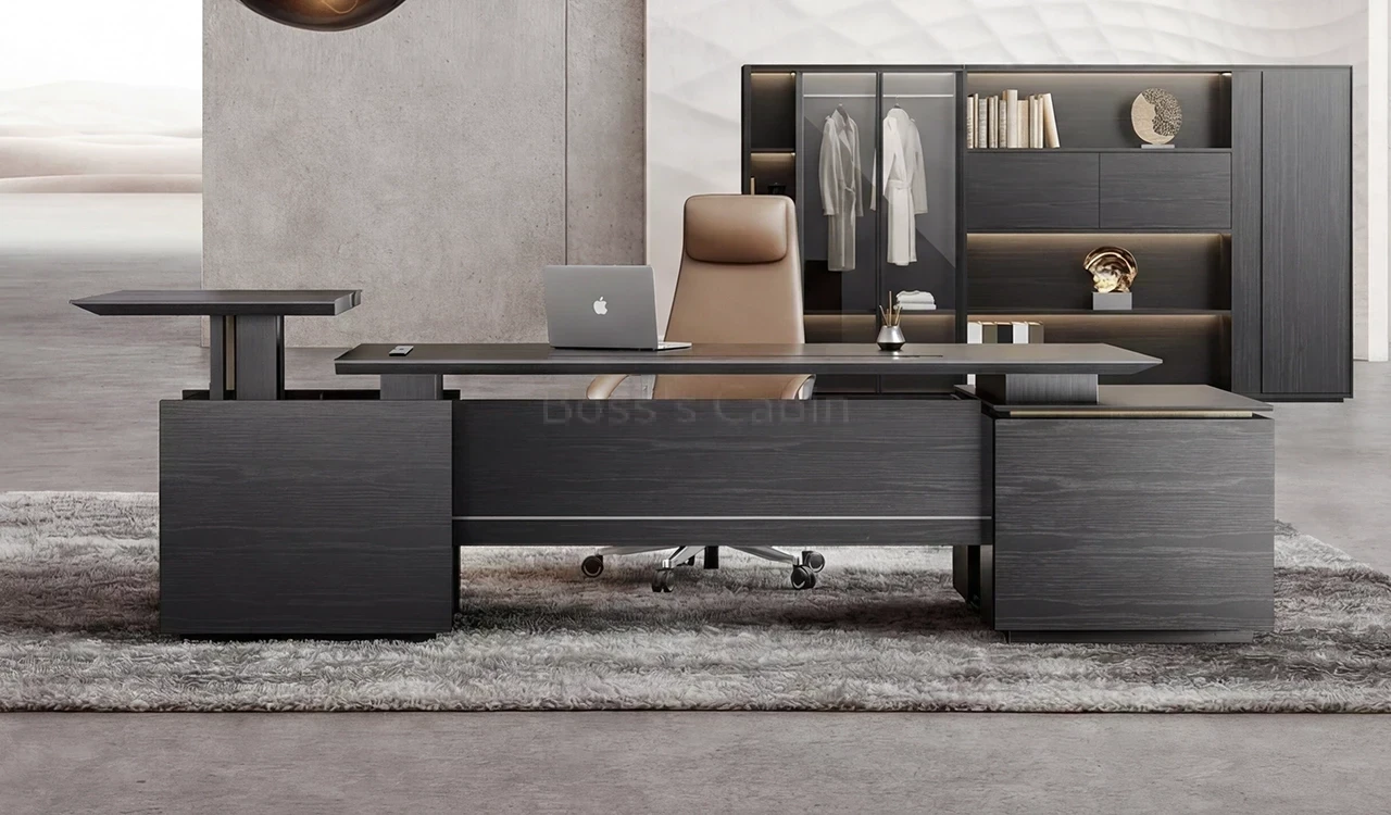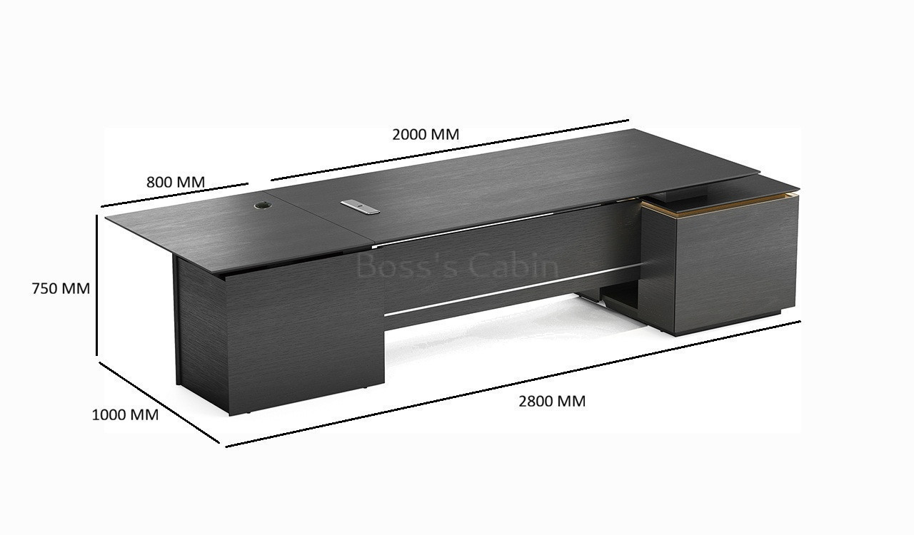 Office desk in 9 feet width with storage pedestals made with environment grade engineered wood and black oak laminate. The E0 grade MDF is a highly durable material and a world standard for premium office furniture while the oak laminate is from our carefully selected range of premium laminates with consistent color and grain structure.
