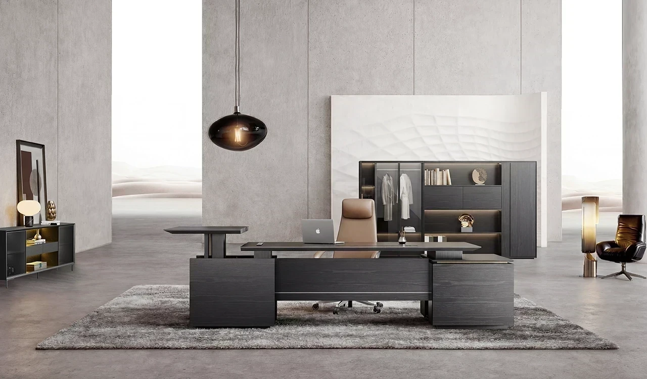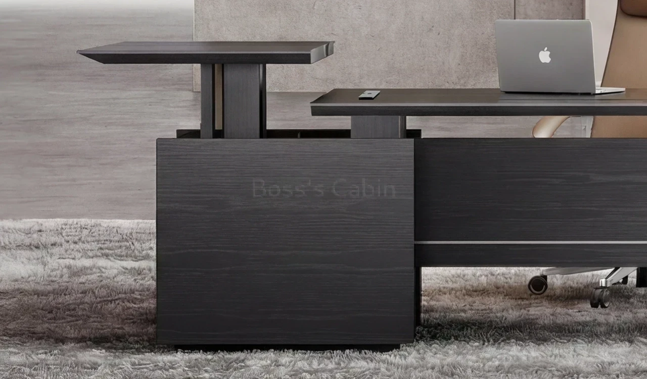 A study in sharp geometry and material contrast, this avant-garde desk pairs textured black oak with elements of steel to create a bold presence. The 2800 mm split tabletop defines function with clarity—a primary work surface complemented by a motorized height-adjustable secondary plane. Sharp 45° beveled edges lend a precise, architectural language. Includes integrated wirebox and storage drawers. Part of the Vizion series that offers an entire range of products to create a unified space.
